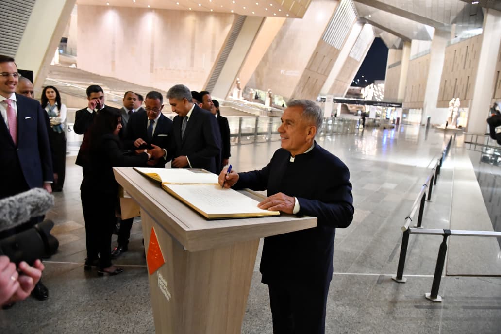 وخلال الزيارة، أعرب رئيس جمهورية تتارستان عن بالغ إعجابه بما شهده بالمتحف من تنظيم متميز، وما يضمه من كنوز أثرية فريدة تعكس عظمة الحضارة المصرية القديمة، مشيداً بجهود الدولة المصرية ووزارة السياحة والآثار وهيئة المتحف المصري الكبير في تقديم تجربة متحفية متكاملة تجمع بين الأصالة والحداثة، فضلًا عن تميز سيناريو العرض وروعة إخراجه.