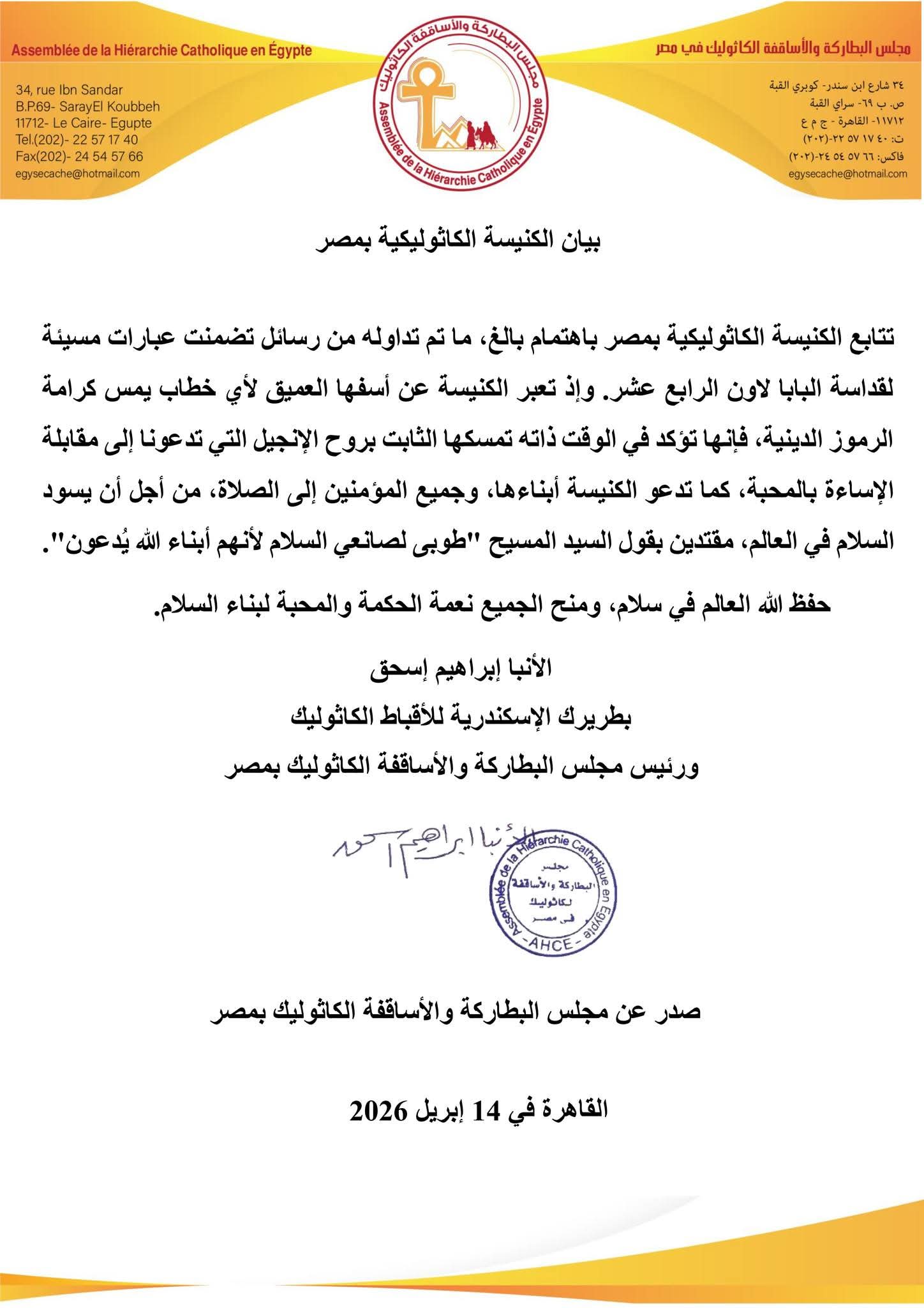 تتابع الكنيسة الكاثوليكية بمصر باهتمام بالغ، ما تم تداوله من رسائل تضمنت عبارات مسيئة لقداسة البابا لاون الرابع عشر.