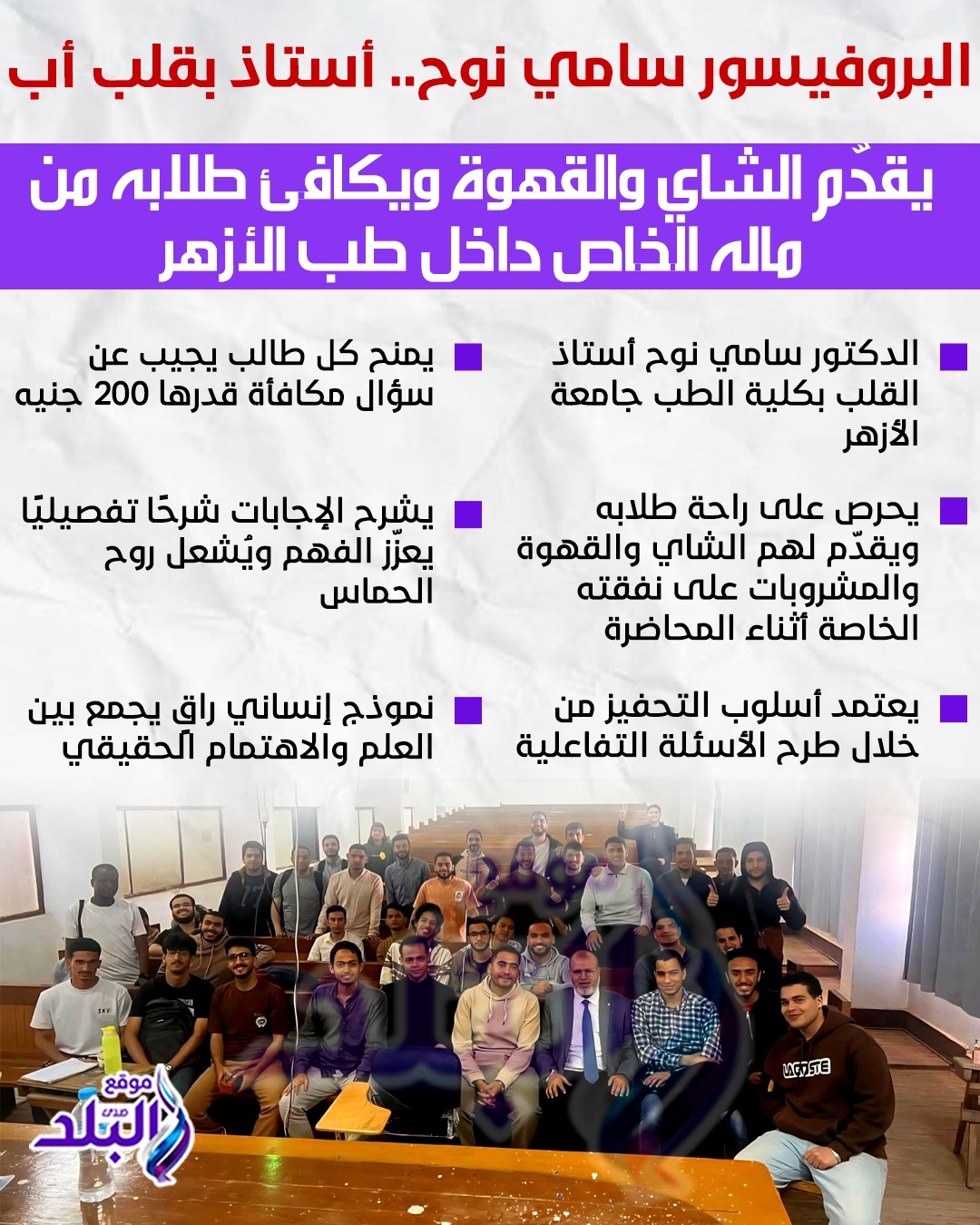 في مشهد يجسّد المعنى الحقيقي للرسالة التعليمية، يقدّم الدكتور سامي نوح، أستاذ القلب والأوعية الدموية واستشاري قسطرة القلب وتوسيع الشرايين التاجية بكلية الطب جامعة الأزهر، نموذجًا استثنائيًا يجمع بين العلم والإنسانية داخل قاعة المحاضرات، وأفعاله الإنسانية تؤكد أن الأستاذ الحقيقي هو من يترك أثرًا في قلوب طلابه قبل عقولهم.