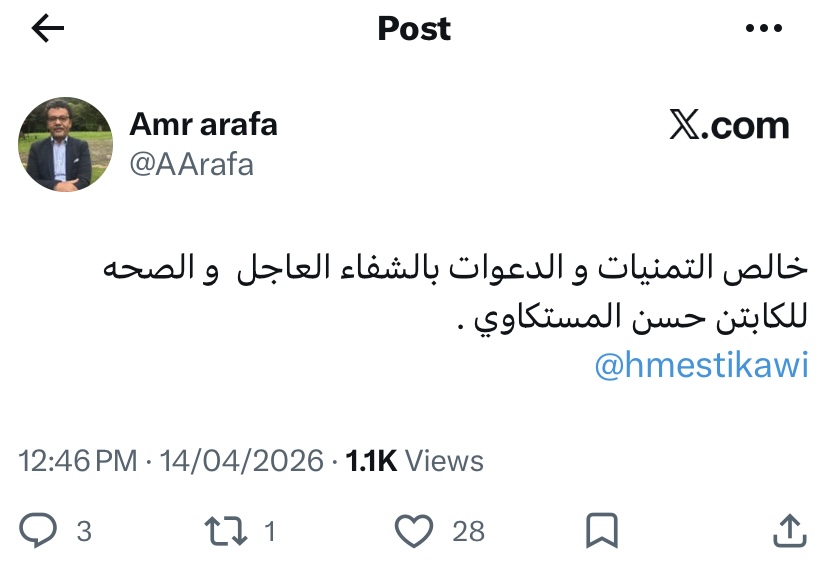 و كتب عمرو عرفة عبر صفحته علي موقع اكس:"خالص التمنيات و الدعوات بالشفاء العاجل و الصحه للكابتن حسن المستكاوي".