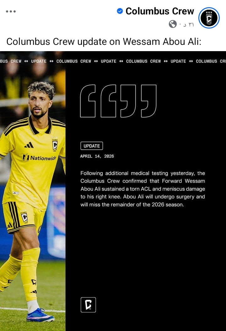 قال نادي كولومبس كرو الأمريكي في بيان رسمي عبر حسابه علي فيسبوك: " بعد إجراء فحوصات طبية إضافية أمس، أكد نادي كولومبوس كرو إصابة المهاجم وسام أبو علي بتمزق في الرباط الصليبي الأمامي وتمزق في الغضروف الهلالي في ركبته اليمنى، وسيخضع أبو علي لعملية جراحية وسيغيب عن بقية موسم 2026 ".