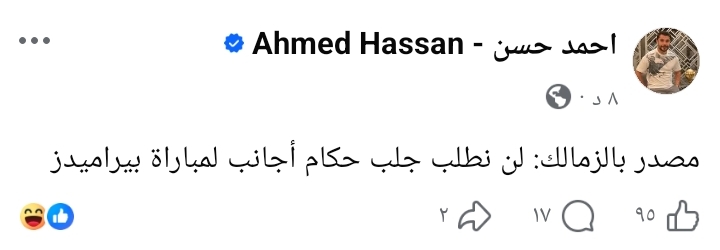 وكتب احمد حسن عبر حسابه علي فيسبوك "مصدر بالزمالك: لن نطلب جلب حكام أجانب لمباراة بيراميدز"