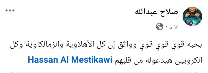 ونشر صلاح عبد الله عبر حسابه علي فيسبوك صورة المستكاوي وعلق قائلا "بحبه قوي قوي قوي وواثق إن كل الأهلاوية والزمالكاوية وكل الكرويين هيدعوله من قلبهم".