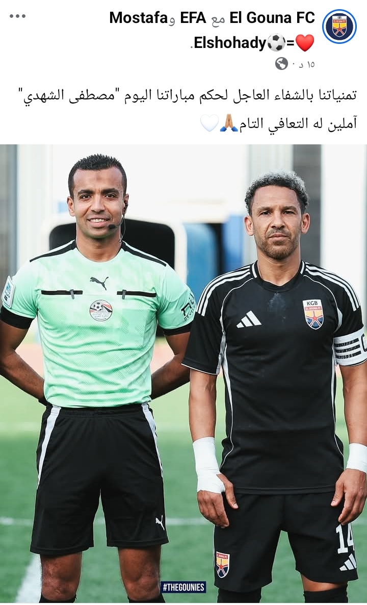 ونشرت الصفحة الرسمية لنادي الجونة عبر حسابها على «فيسبوك» صورة لمصطفى الشهدي، وعلّقت: «تمنياتنا بالشفاء العاجل لحكم مباراتنا اليوم مصطفى الشهدي، آملين له التعافي التام».