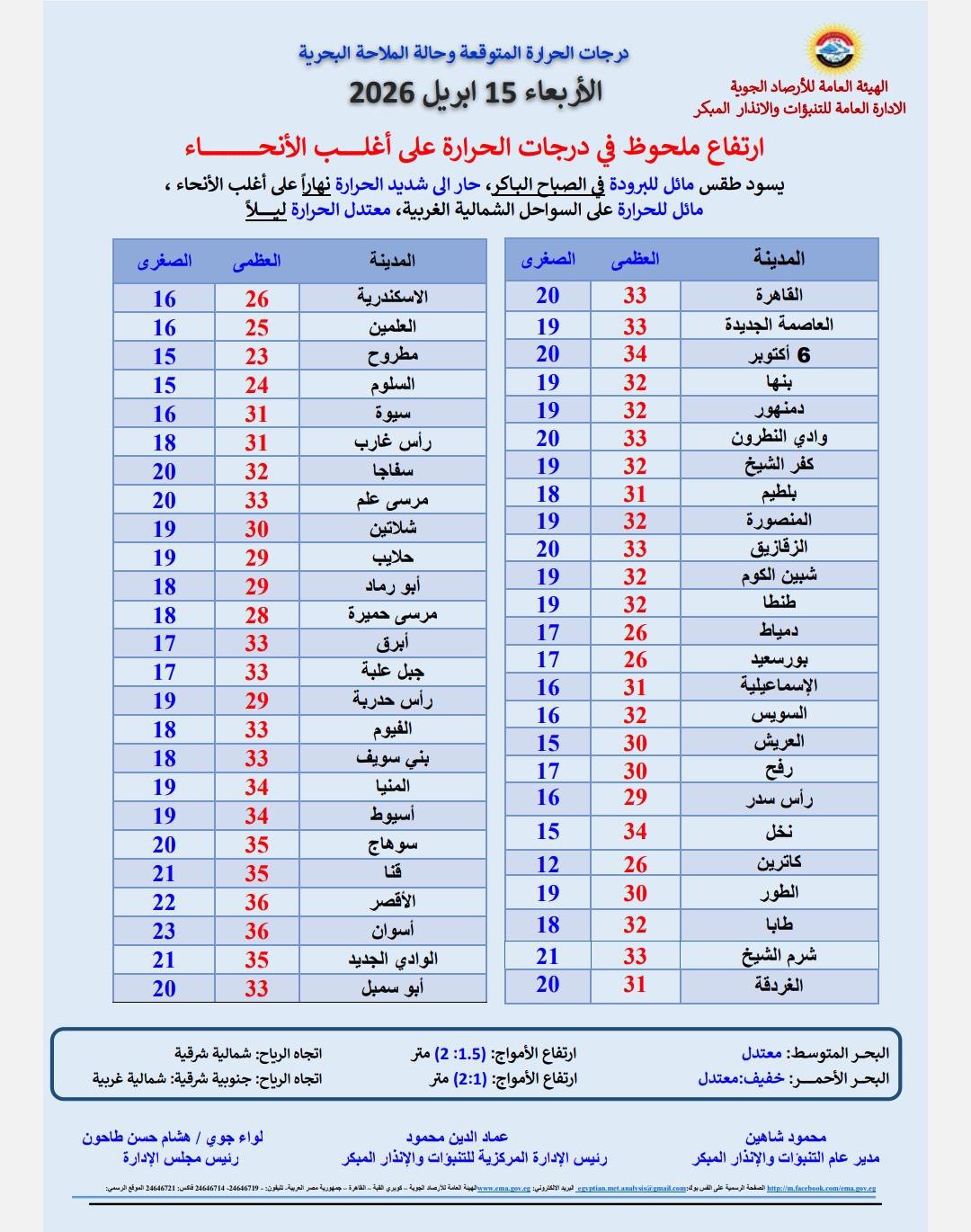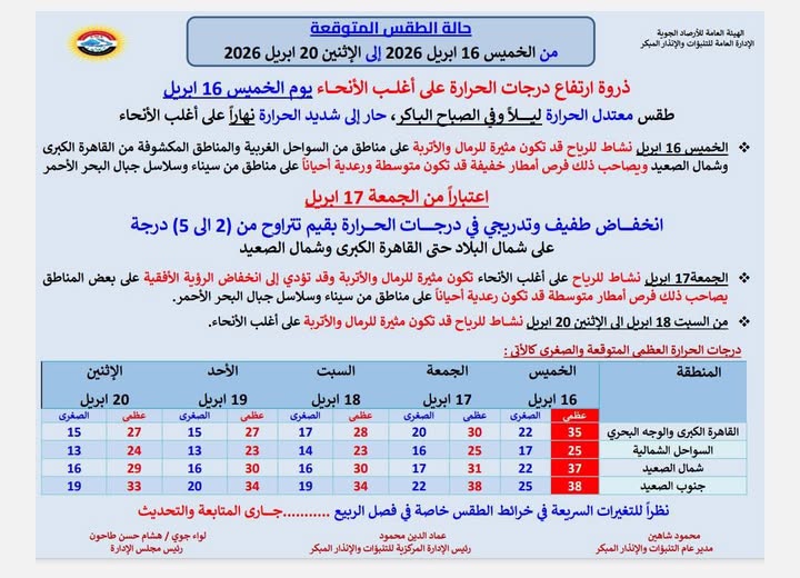 تشهد مصر غدًا الأربعاء 15 أبريل 2026 موجة حارة قوية تضرب أغلب المحافظات، وفق توقعات الهيئة العامة للأرصاد الجوية، وسط تحذيرات من ارتفاع ملحوظ في درجات الحرارة ونشاط للرياح قد يزيد الإحساس بحرارة الطقس، خاصة في المناطق المكشوفة، حيث تصل الحرارة إلى 38 درجة على جنوب البلاد بحلول الخميس.