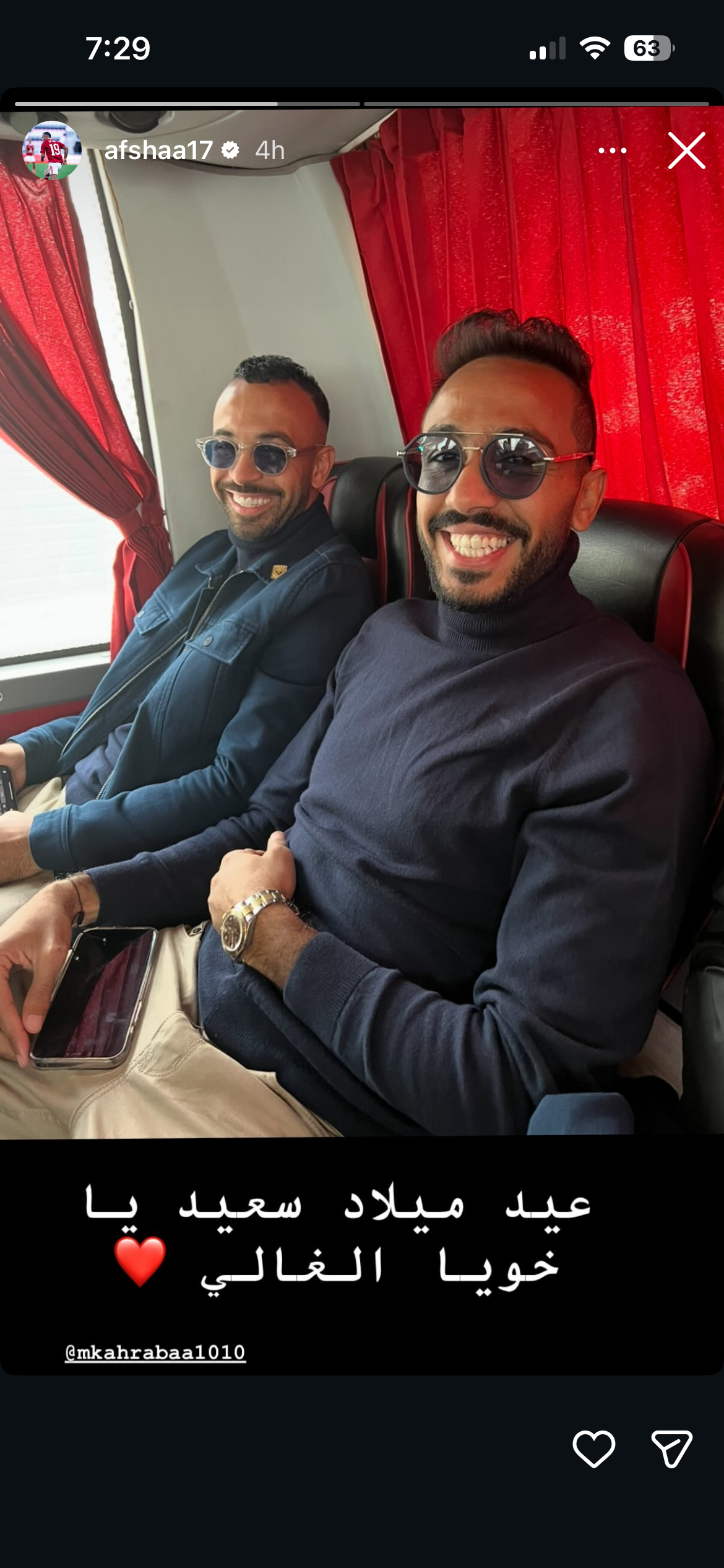 وكتب “أفشة” عبر الاستوري على صورة تجمعه مع كهربا: “عيد ميلاد سعيد يا أخويا”.