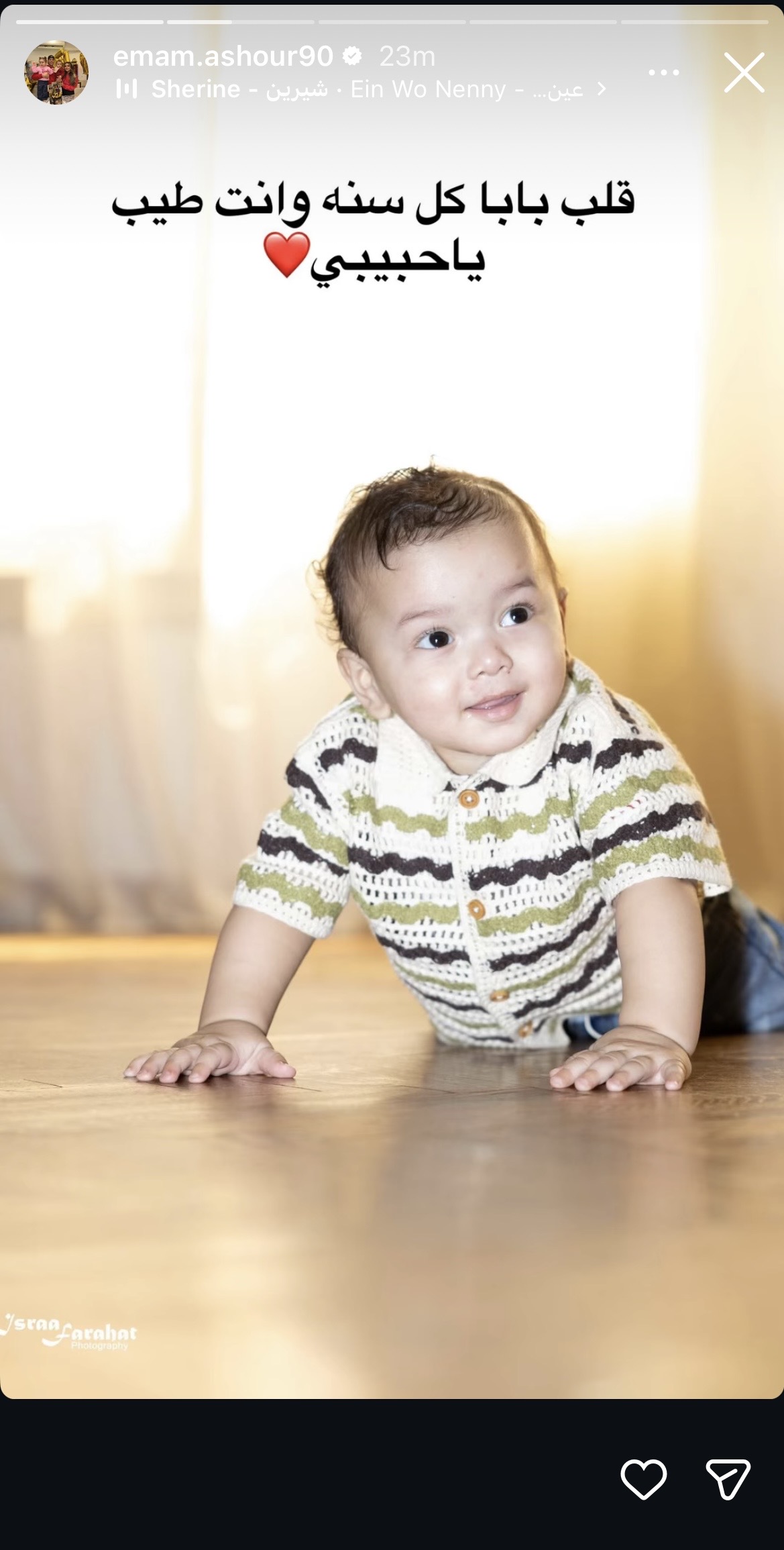 وأعرب إمام عاشور، عن سعادته وحبه لنجله، وكتب: “عيد ميلاد سعيد فهوده بحبك”.