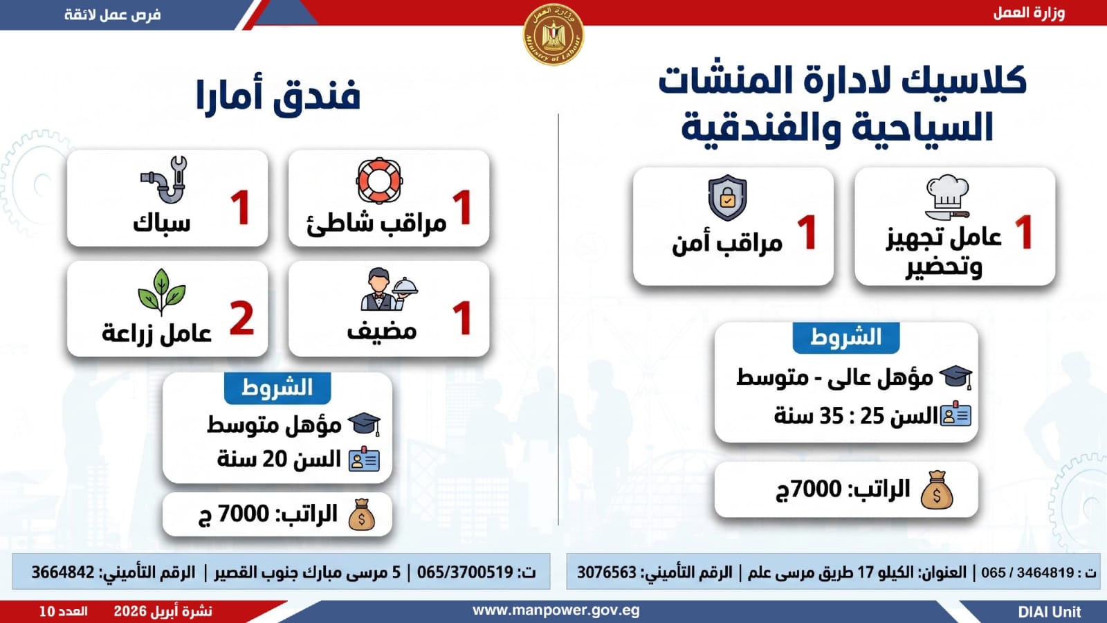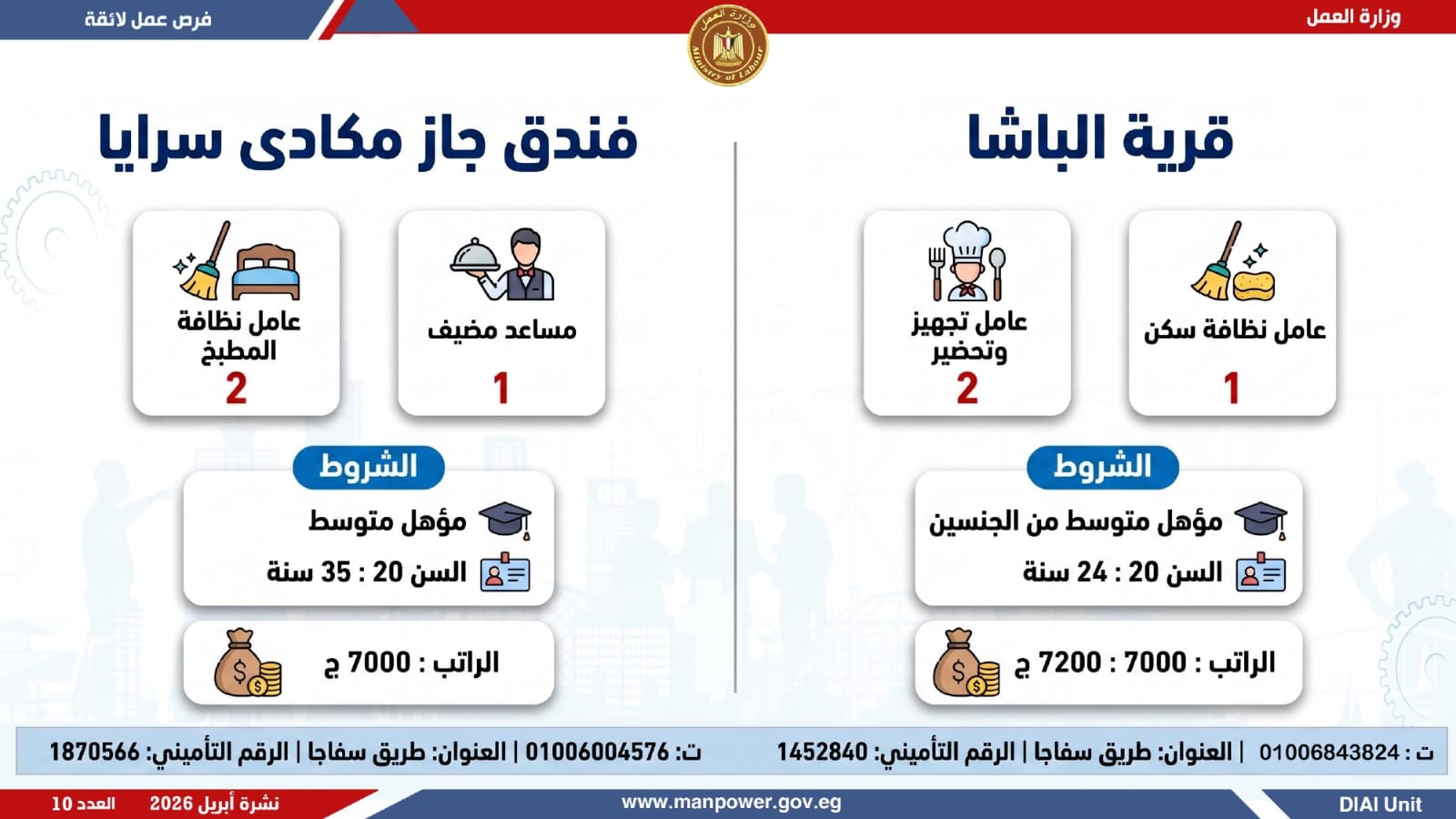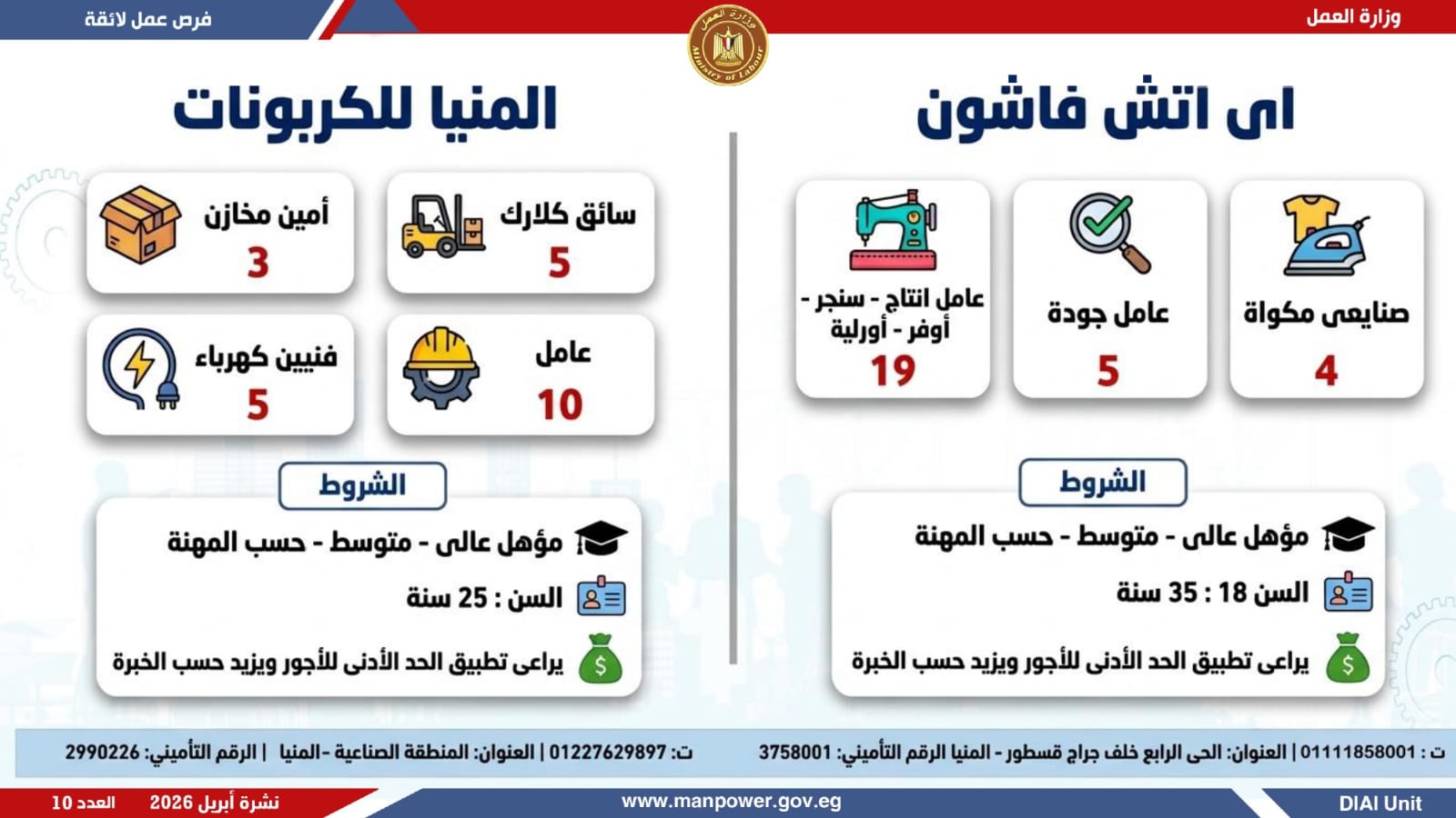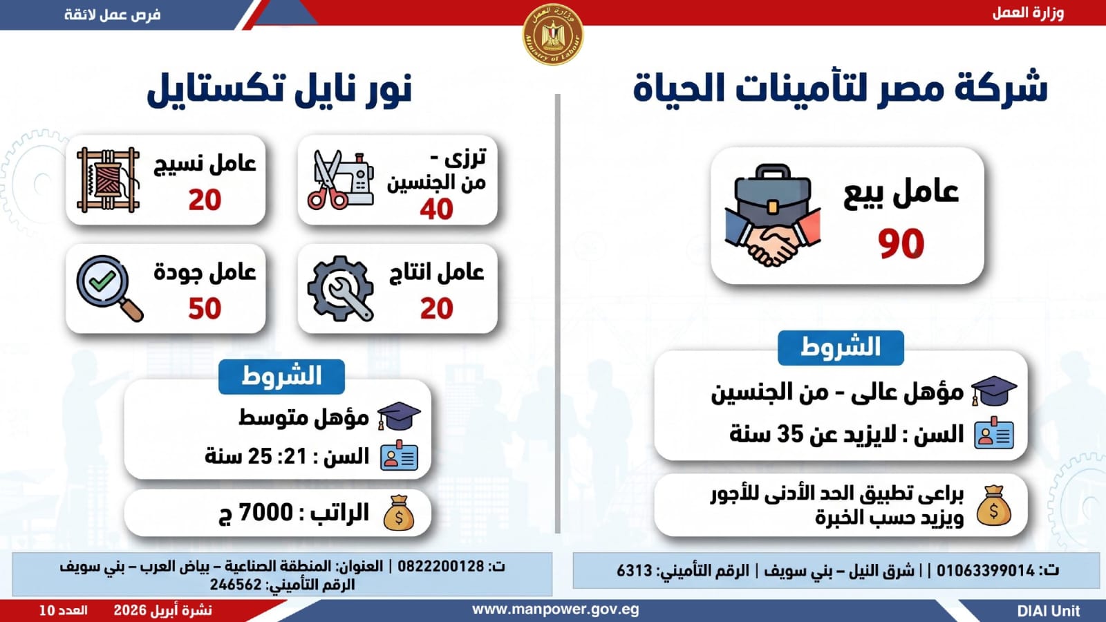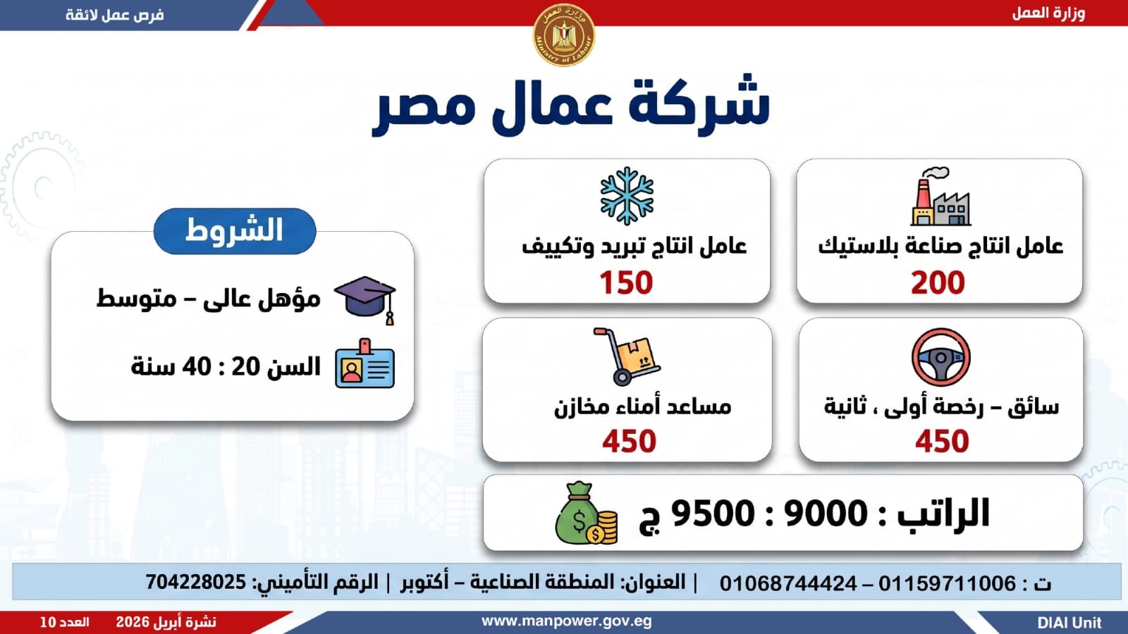 وأوضحت وزارة العمل في بيان لها اليوم أن نشرة التوظيف تتضمن فرصًا متعددة في عشرات المهن والتخصصات، برواتب مجزية يتم تحديدها وفق طبيعة كل وظيفة ونتائج المقابلات الشخصية، مع الالتزام الكامل بتطبيق الحد الأدنى للأجور، فضلًا عن توفير مظلة التأمينات الاجتماعية والصحية، بما يضمن بيئة عمل مستقرة وآمنة تحافظ على حقوق العامل وكرامته...كما تشمل النشرة عددًا من الفرص المخصصة لذوي الهمم، في إطار توجه الدولة نحو تعزيز دمجهم في سوق العمل وإتاحة الفرص المناسبة لقدراتهم...وتغطي فرص العمل الجديدة محافظات: القاهرة، الجيزة، الإسكندرية، الفيوم، الغربية، المنيا، بني سويف، السويس، الأقصر، المنوفية، أسيوط، قنا، والبحر الأحمر، في تخصصات متنوعة تشمل: التسويق، الموارد البشرية، الهندسة (اتصالات وكهرباء)، الميكانيكا والتحكم الكهربائي، الصيانة، المحاسبة، الإشراف الفني والموقعي، الإنتاج، المشتريات، المبيعات، الجودة، الأمن، المخازن، القيادة برخص مختلفة، الفندقة والمطاعم، إلى جانب أعمال الإنتاج والنظافة وعدد من التخصصات الأخرى.