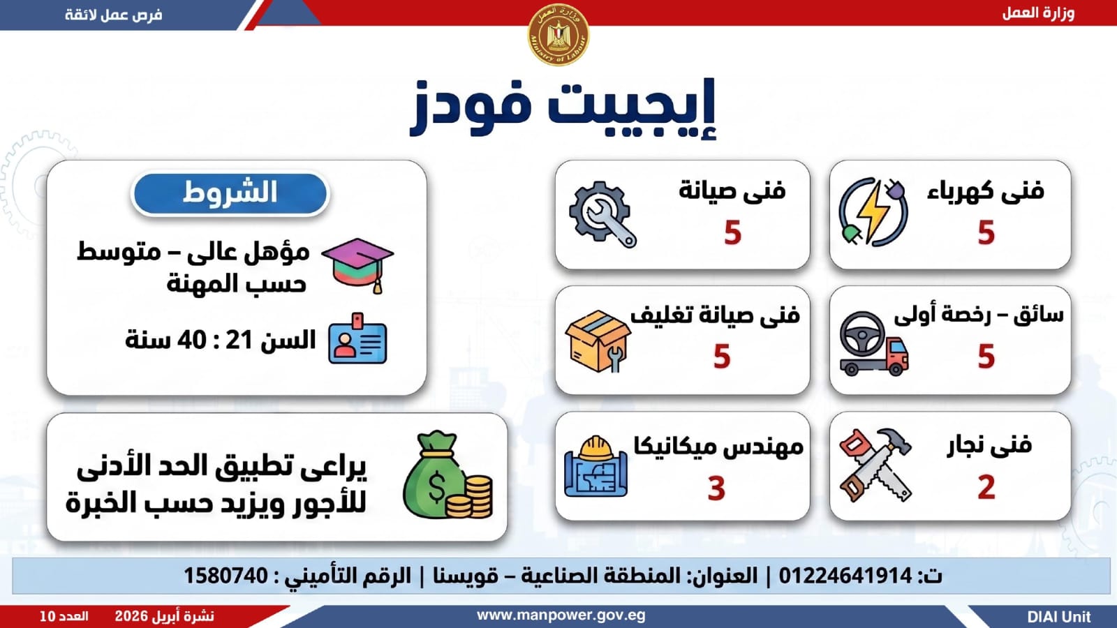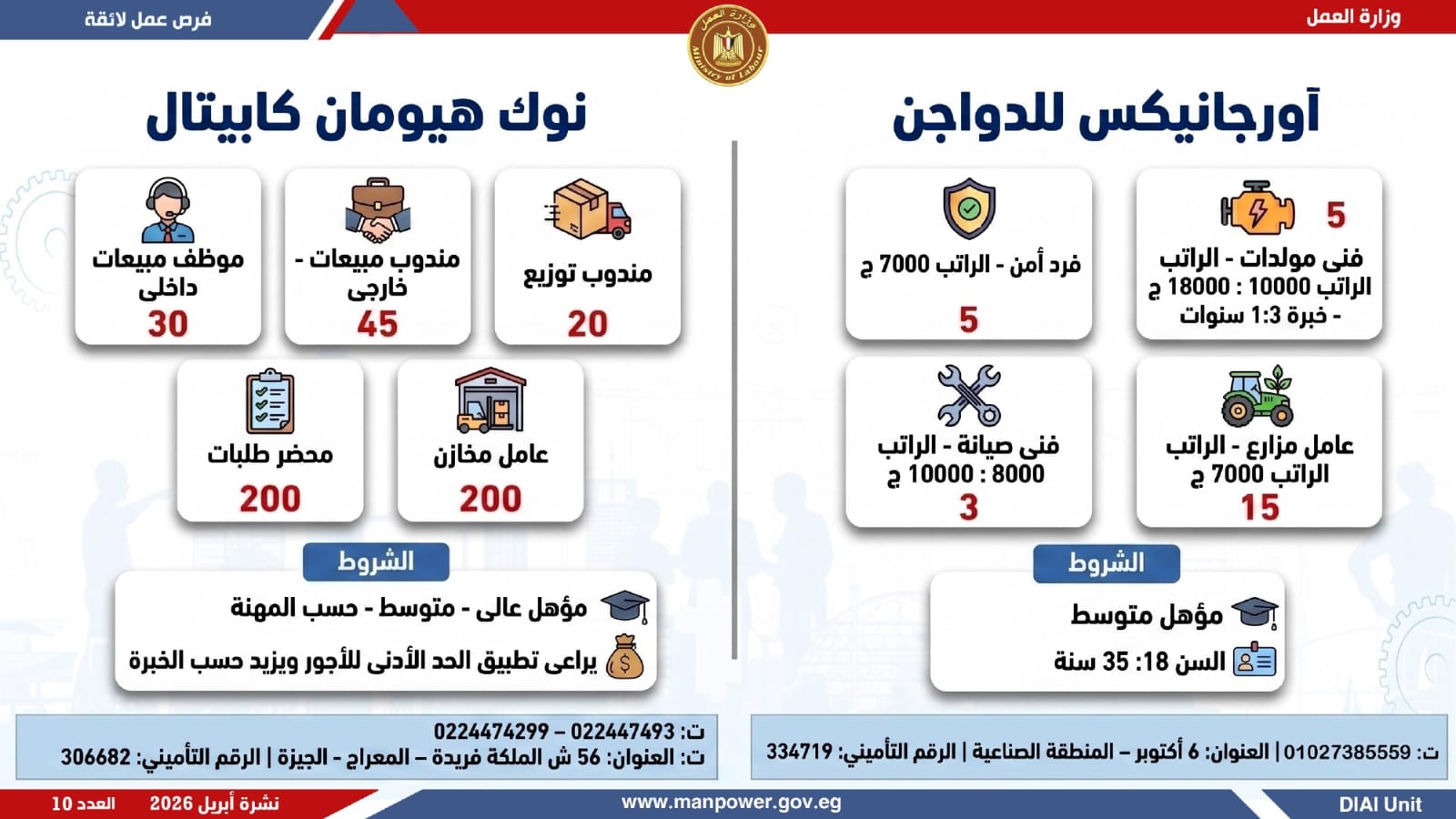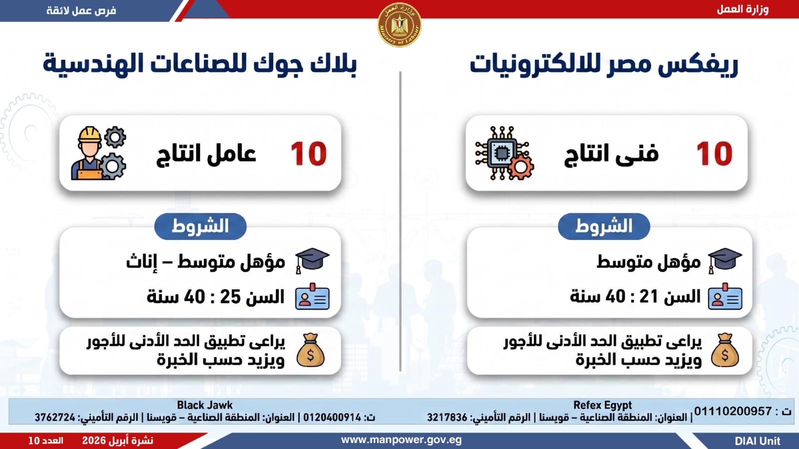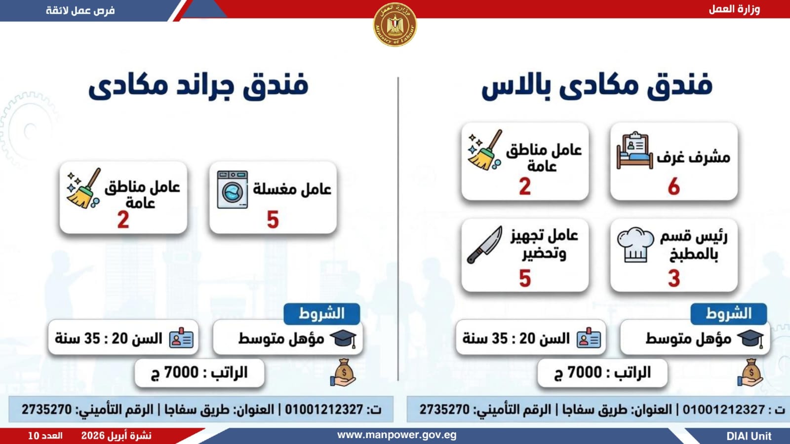 وأوضحت وزارة العمل في بيان لها اليوم أن نشرة التوظيف تتضمن فرصًا متعددة في عشرات المهن والتخصصات، برواتب مجزية يتم تحديدها وفق طبيعة كل وظيفة ونتائج المقابلات الشخصية، مع الالتزام الكامل بتطبيق الحد الأدنى للأجور، فضلًا عن توفير مظلة التأمينات الاجتماعية والصحية، بما يضمن بيئة عمل مستقرة وآمنة تحافظ على حقوق العامل وكرامته...كما تشمل النشرة عددًا من الفرص المخصصة لذوي الهمم، في إطار توجه الدولة نحو تعزيز دمجهم في سوق العمل وإتاحة الفرص المناسبة لقدراتهم...وتغطي فرص العمل الجديدة محافظات: القاهرة، الجيزة، الإسكندرية، الفيوم، الغربية، المنيا، بني سويف، السويس، الأقصر، المنوفية، أسيوط، قنا، والبحر الأحمر، في تخصصات متنوعة تشمل: التسويق، الموارد البشرية، الهندسة (اتصالات وكهرباء)، الميكانيكا والتحكم الكهربائي، الصيانة، المحاسبة، الإشراف الفني والموقعي، الإنتاج، المشتريات، المبيعات، الجودة، الأمن، المخازن، القيادة برخص مختلفة، الفندقة والمطاعم، إلى جانب أعمال الإنتاج والنظافة وعدد من التخصصات الأخرى.