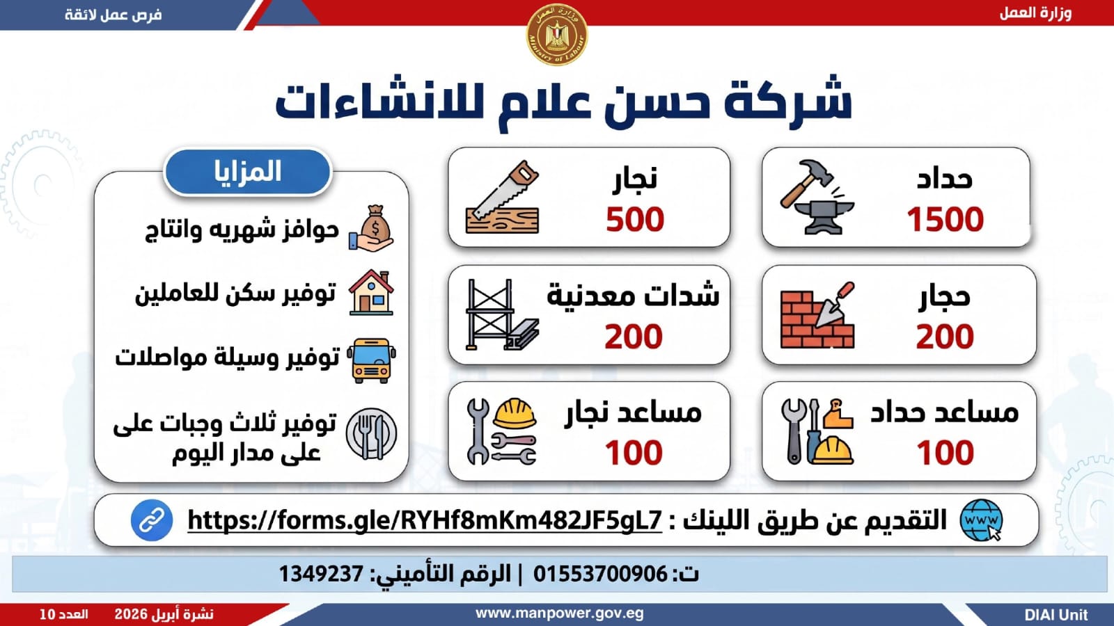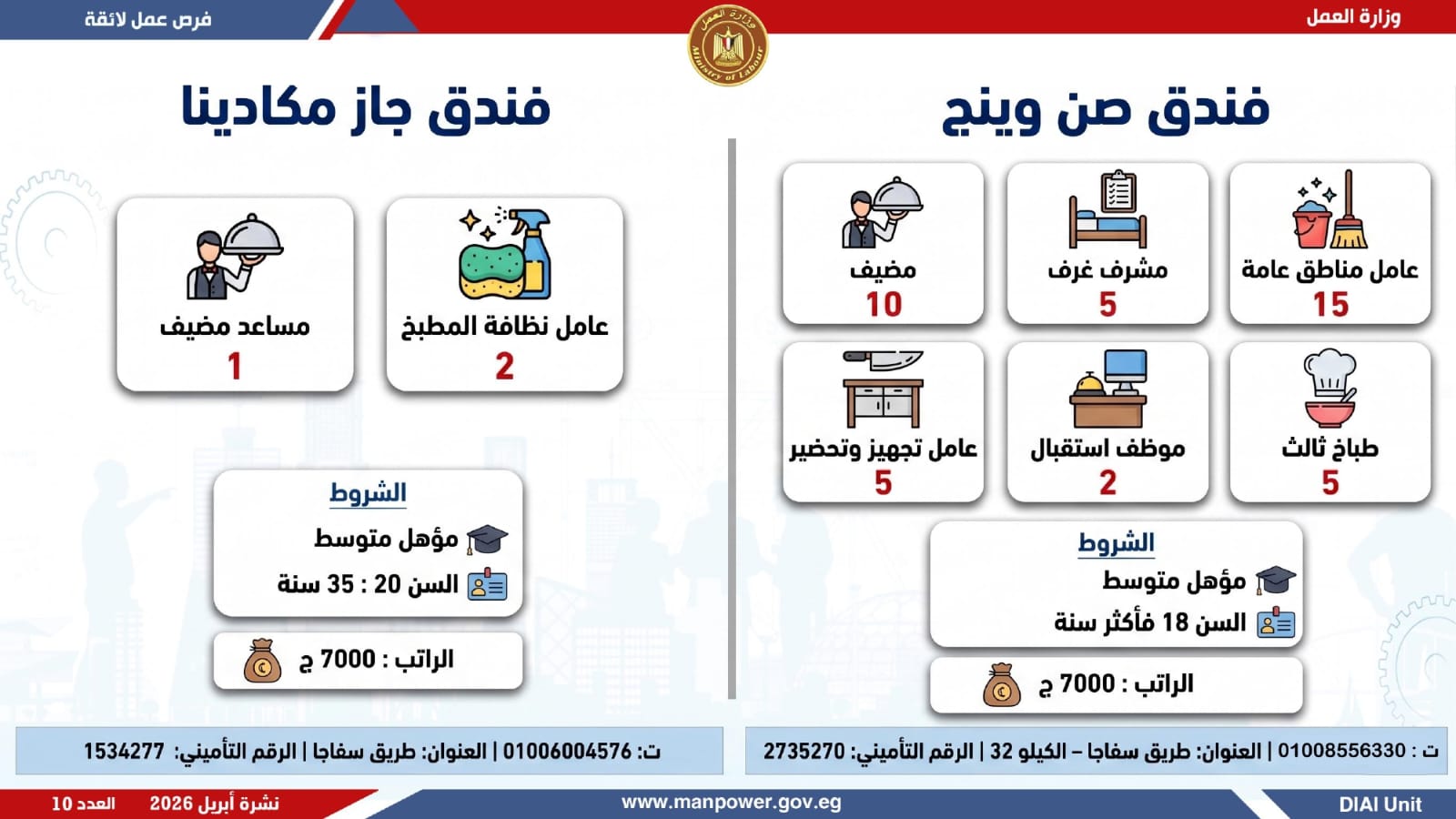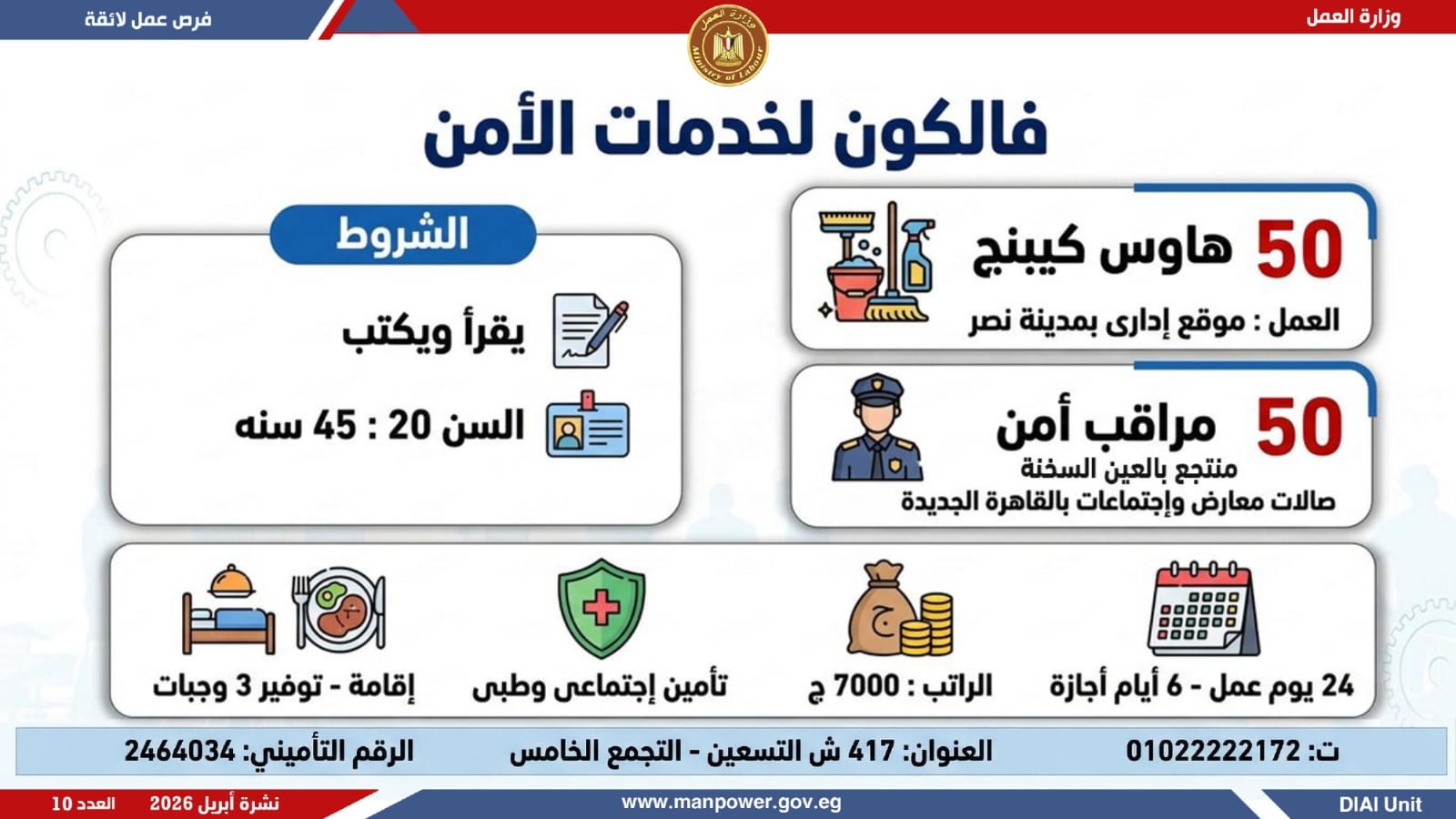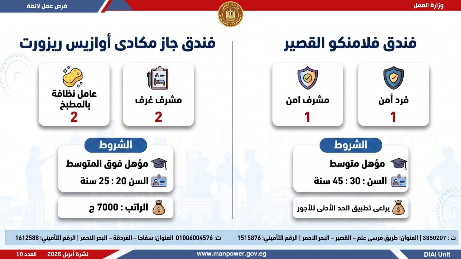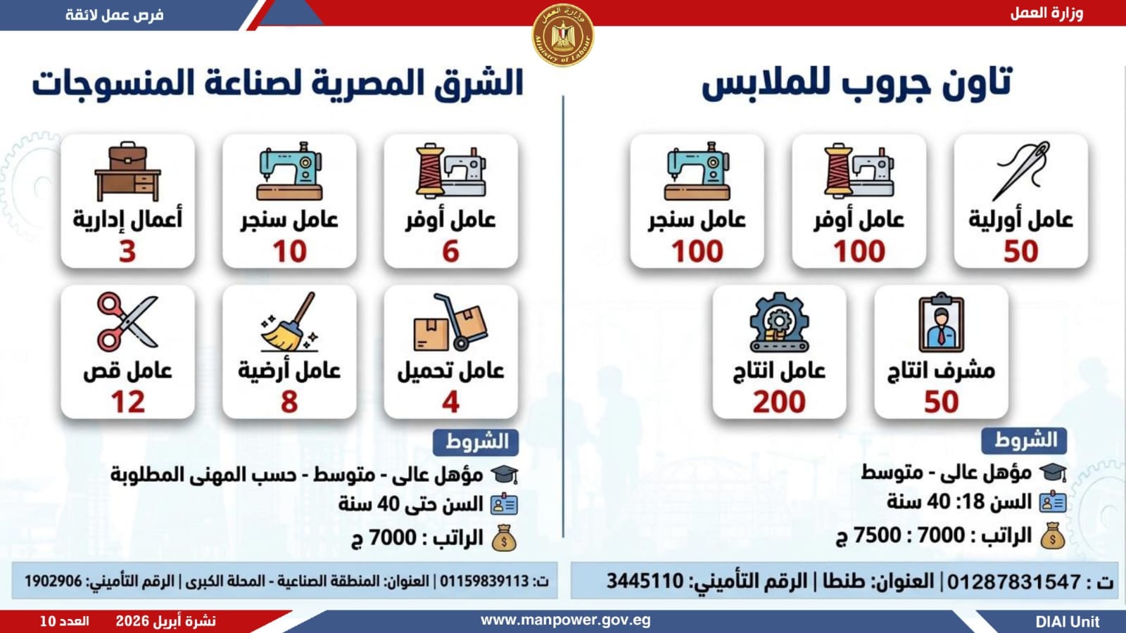 وأوضحت وزارة العمل في بيان لها اليوم أن نشرة التوظيف تتضمن فرصًا متعددة في عشرات المهن والتخصصات، برواتب مجزية يتم تحديدها وفق طبيعة كل وظيفة ونتائج المقابلات الشخصية، مع الالتزام الكامل بتطبيق الحد الأدنى للأجور، فضلًا عن توفير مظلة التأمينات الاجتماعية والصحية، بما يضمن بيئة عمل مستقرة وآمنة تحافظ على حقوق العامل وكرامته...كما تشمل النشرة عددًا من الفرص المخصصة لذوي الهمم، في إطار توجه الدولة نحو تعزيز دمجهم في سوق العمل وإتاحة الفرص المناسبة لقدراتهم...وتغطي فرص العمل الجديدة محافظات: القاهرة، الجيزة، الإسكندرية، الفيوم، الغربية، المنيا، بني سويف، السويس، الأقصر، المنوفية، أسيوط، قنا، والبحر الأحمر، في تخصصات متنوعة تشمل: التسويق، الموارد البشرية، الهندسة (اتصالات وكهرباء)، الميكانيكا والتحكم الكهربائي، الصيانة، المحاسبة، الإشراف الفني والموقعي، الإنتاج، المشتريات، المبيعات، الجودة، الأمن، المخازن، القيادة برخص مختلفة، الفندقة والمطاعم، إلى جانب أعمال الإنتاج والنظافة وعدد من التخصصات الأخرى.