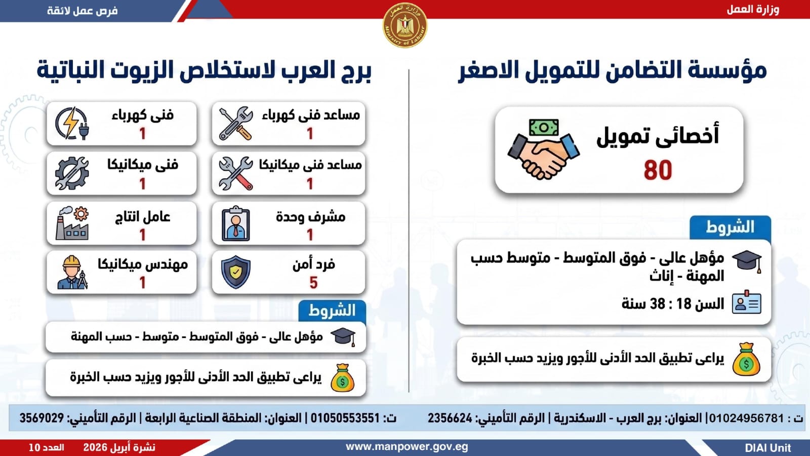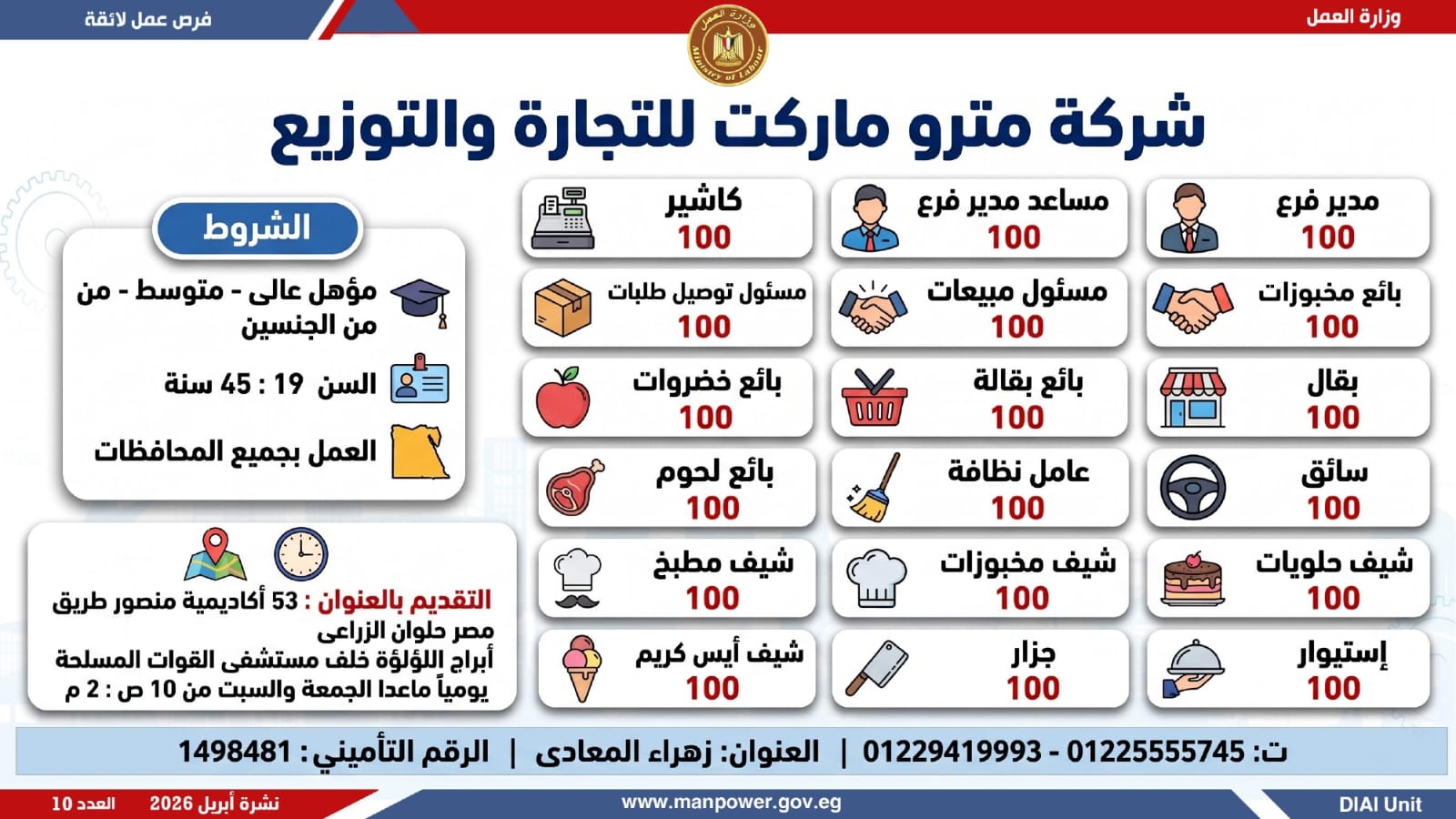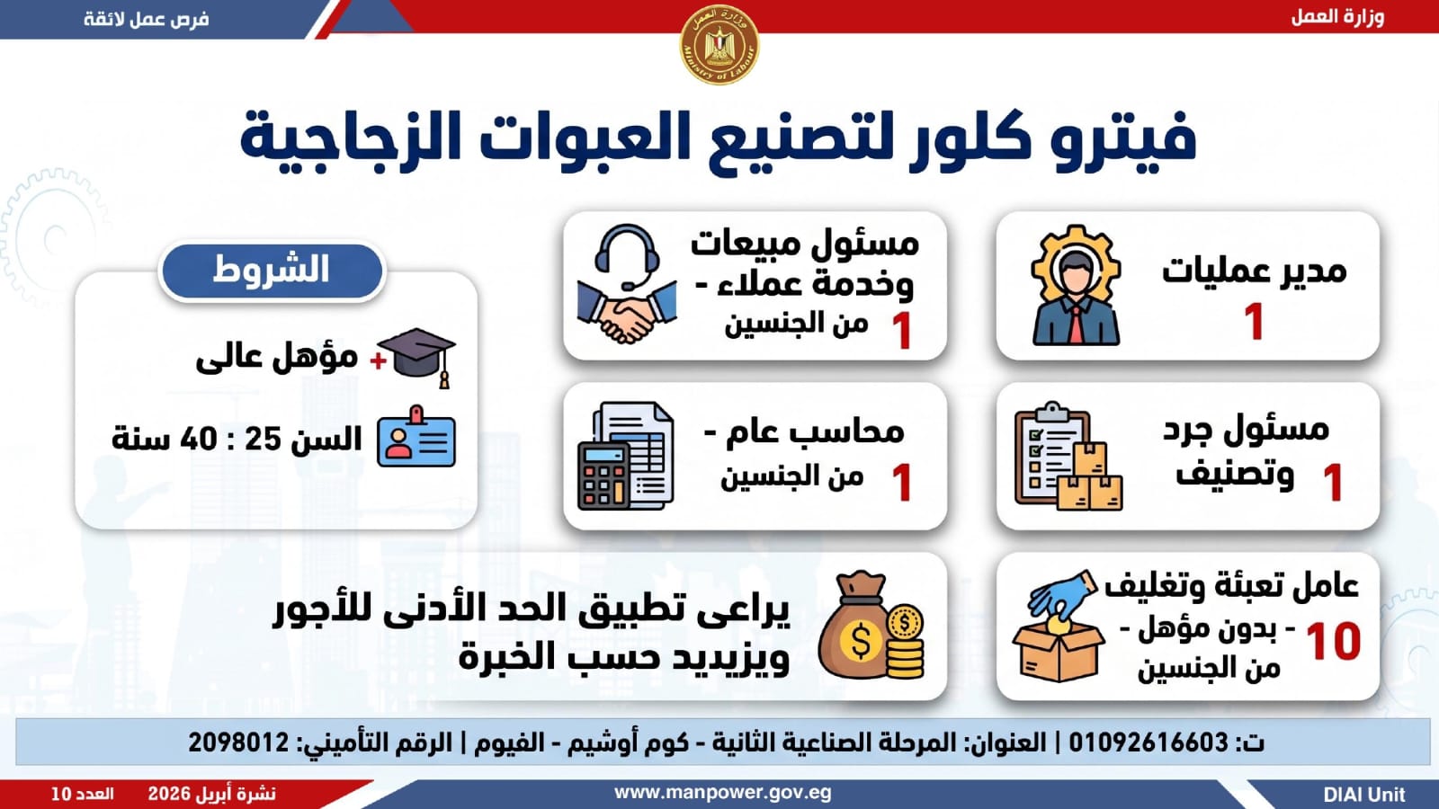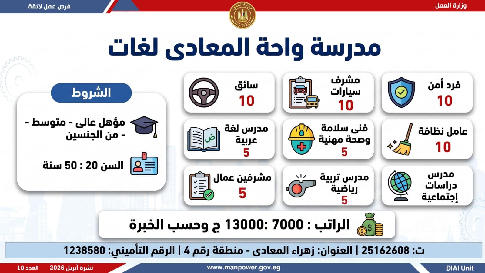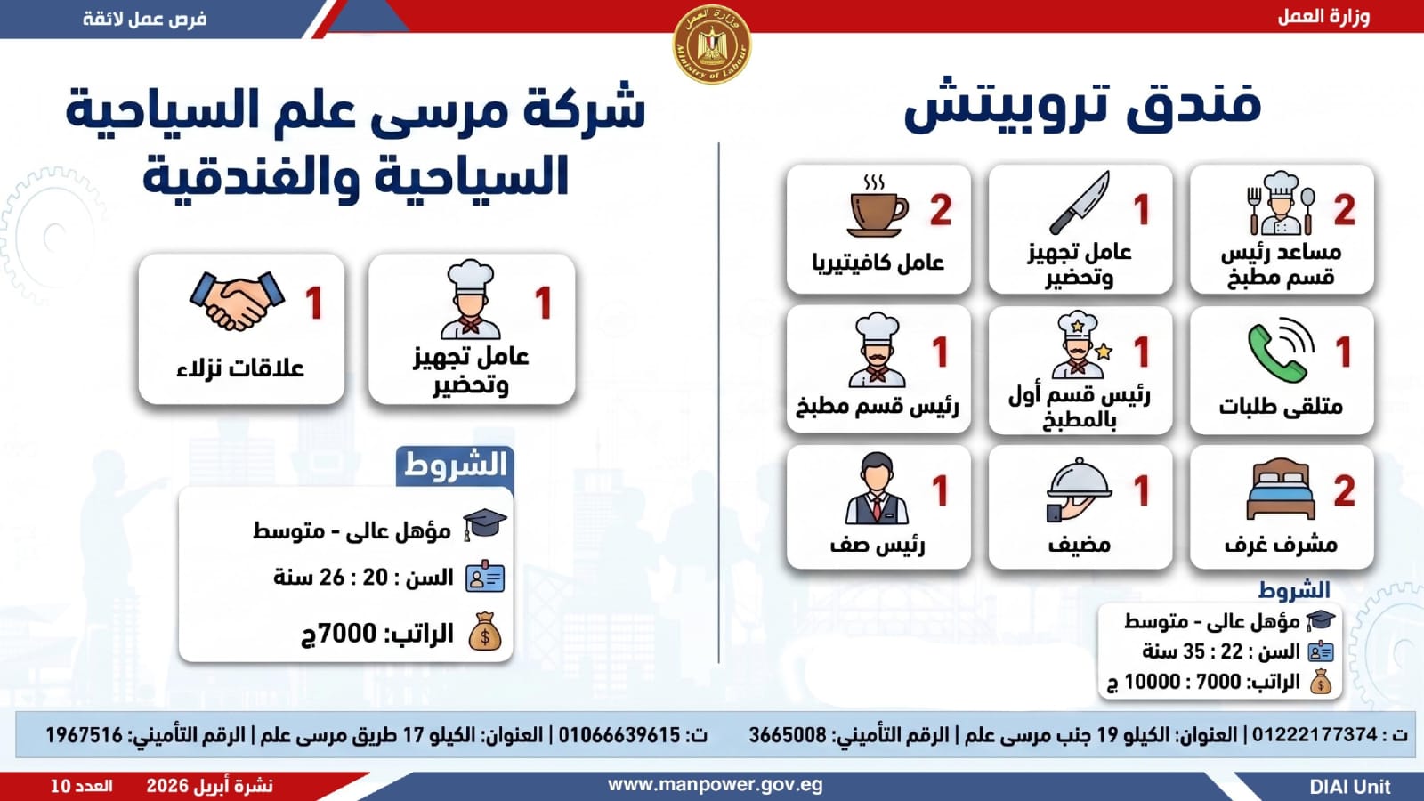 وأوضحت وزارة العمل في بيان لها اليوم أن نشرة التوظيف تتضمن فرصًا متعددة في عشرات المهن والتخصصات، برواتب مجزية يتم تحديدها وفق طبيعة كل وظيفة ونتائج المقابلات الشخصية، مع الالتزام الكامل بتطبيق الحد الأدنى للأجور، فضلًا عن توفير مظلة التأمينات الاجتماعية والصحية، بما يضمن بيئة عمل مستقرة وآمنة تحافظ على حقوق العامل وكرامته...كما تشمل النشرة عددًا من الفرص المخصصة لذوي الهمم، في إطار توجه الدولة نحو تعزيز دمجهم في سوق العمل وإتاحة الفرص المناسبة لقدراتهم...وتغطي فرص العمل الجديدة محافظات: القاهرة، الجيزة، الإسكندرية، الفيوم، الغربية، المنيا، بني سويف، السويس، الأقصر، المنوفية، أسيوط، قنا، والبحر الأحمر، في تخصصات متنوعة تشمل: التسويق، الموارد البشرية، الهندسة (اتصالات وكهرباء)، الميكانيكا والتحكم الكهربائي، الصيانة، المحاسبة، الإشراف الفني والموقعي، الإنتاج، المشتريات، المبيعات، الجودة، الأمن، المخازن، القيادة برخص مختلفة، الفندقة والمطاعم، إلى جانب أعمال الإنتاج والنظافة وعدد من التخصصات الأخرى.