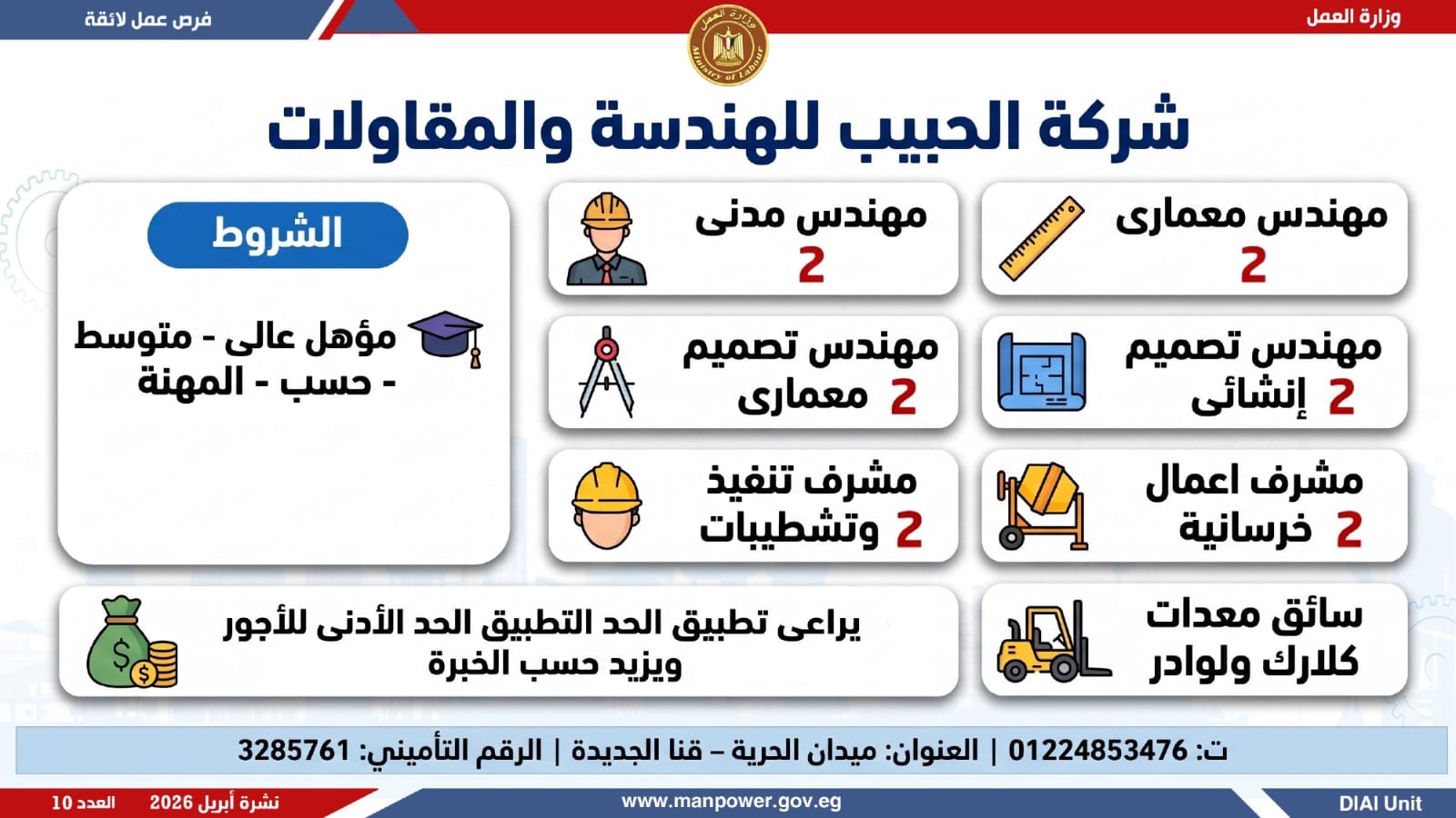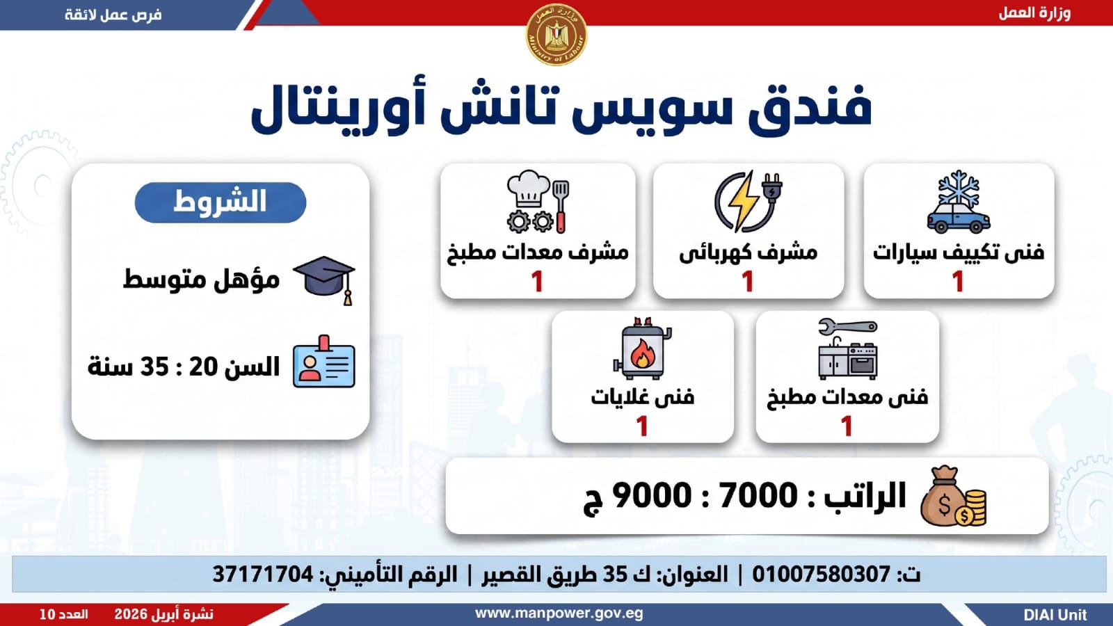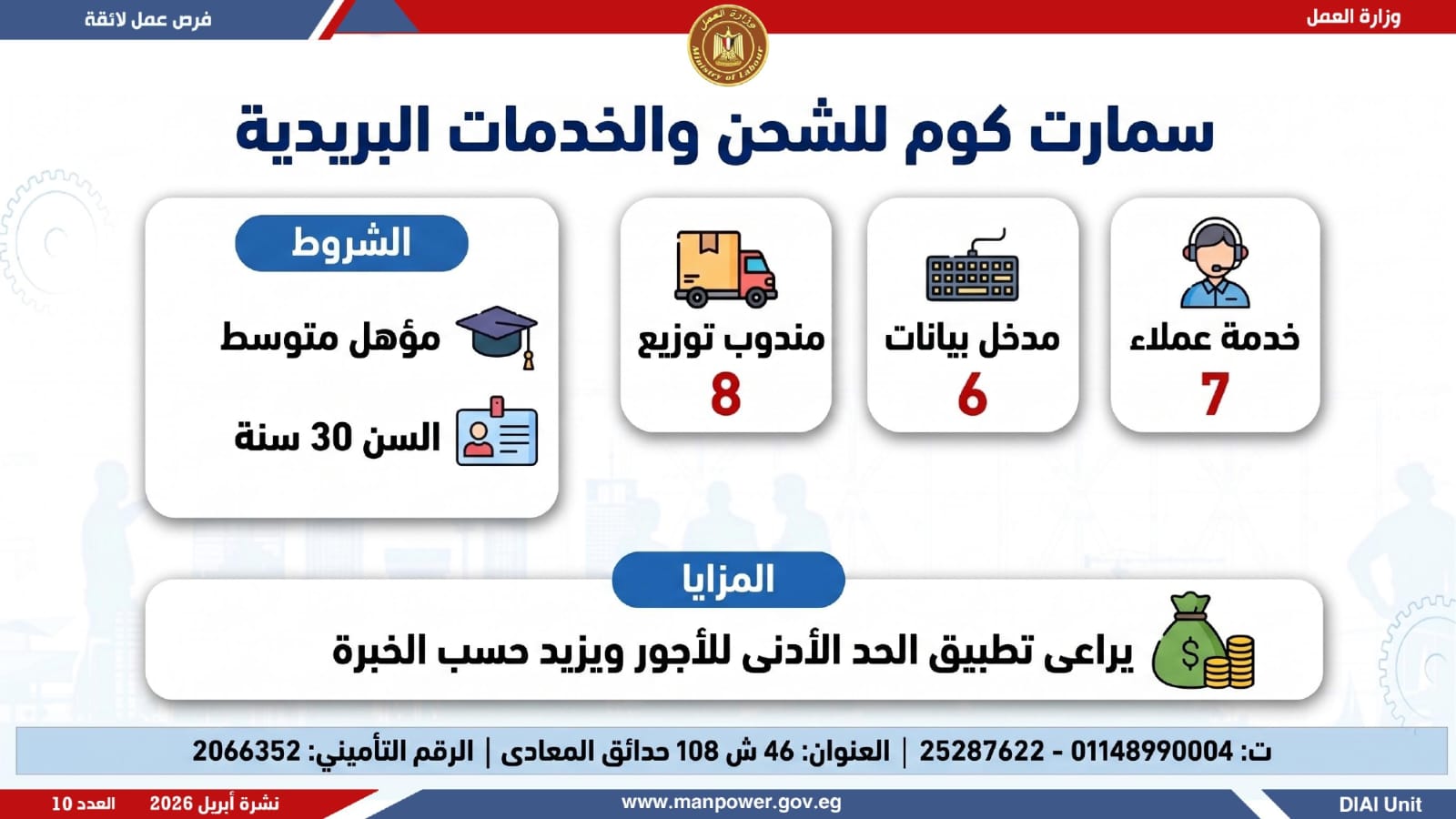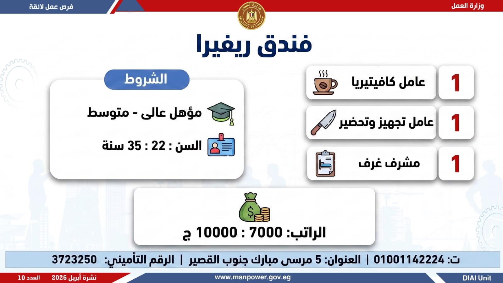 وأوضحت وزارة العمل في بيان لها اليوم أن نشرة التوظيف تتضمن فرصًا متعددة في عشرات المهن والتخصصات، برواتب مجزية يتم تحديدها وفق طبيعة كل وظيفة ونتائج المقابلات الشخصية، مع الالتزام الكامل بتطبيق الحد الأدنى للأجور، فضلًا عن توفير مظلة التأمينات الاجتماعية والصحية، بما يضمن بيئة عمل مستقرة وآمنة تحافظ على حقوق العامل وكرامته...كما تشمل النشرة عددًا من الفرص المخصصة لذوي الهمم، في إطار توجه الدولة نحو تعزيز دمجهم في سوق العمل وإتاحة الفرص المناسبة لقدراتهم...وتغطي فرص العمل الجديدة محافظات: القاهرة، الجيزة، الإسكندرية، الفيوم، الغربية، المنيا، بني سويف، السويس، الأقصر، المنوفية، أسيوط، قنا، والبحر الأحمر، في تخصصات متنوعة تشمل: التسويق، الموارد البشرية، الهندسة (اتصالات وكهرباء)، الميكانيكا والتحكم الكهربائي، الصيانة، المحاسبة، الإشراف الفني والموقعي، الإنتاج، المشتريات، المبيعات، الجودة، الأمن، المخازن، القيادة برخص مختلفة، الفندقة والمطاعم، إلى جانب أعمال الإنتاج والنظافة وعدد من التخصصات الأخرى.