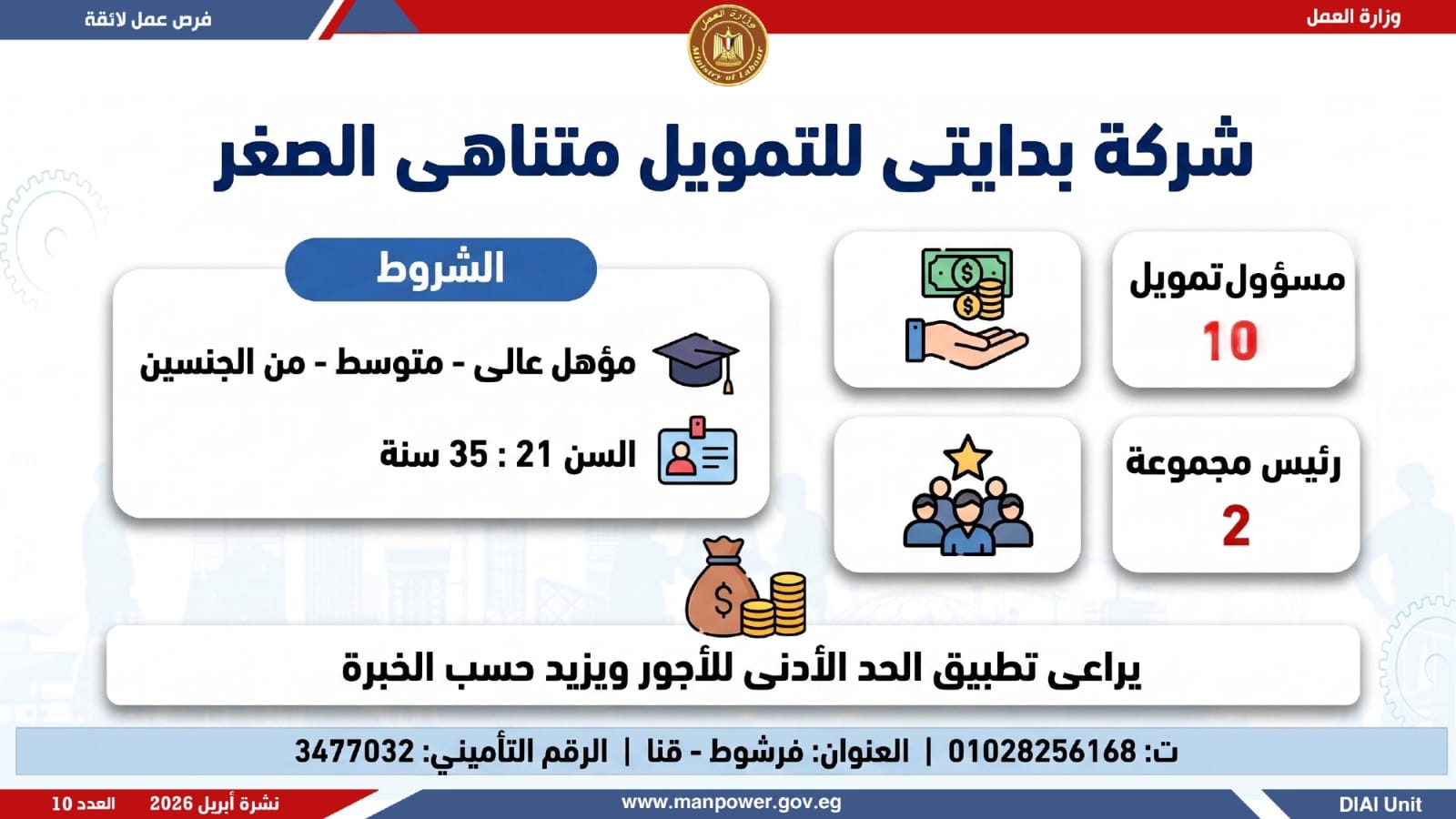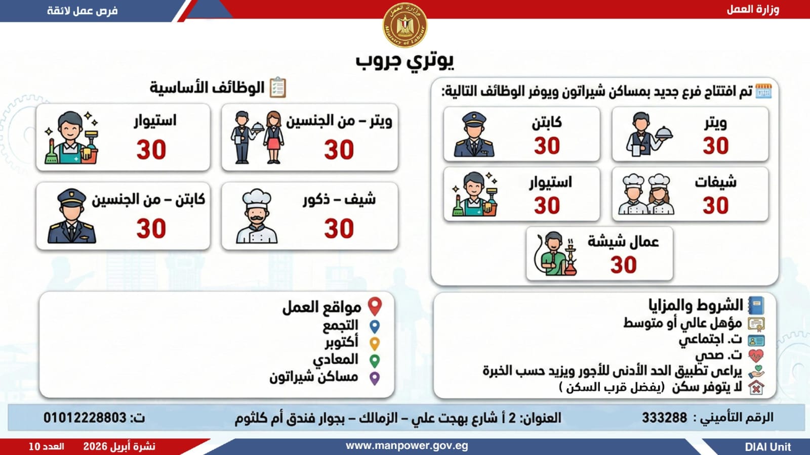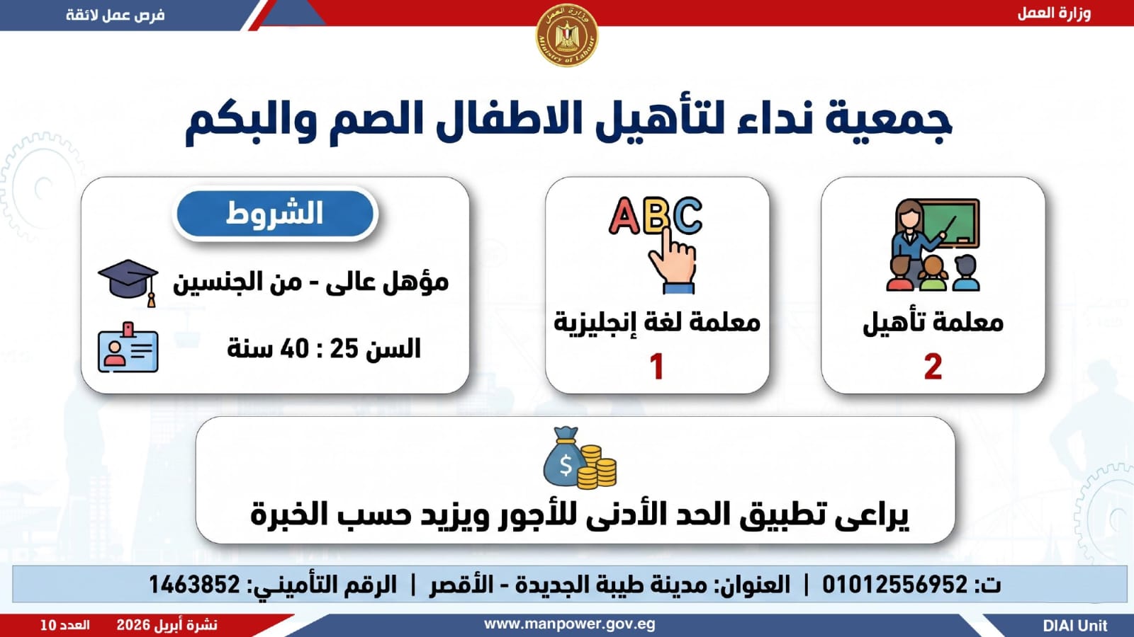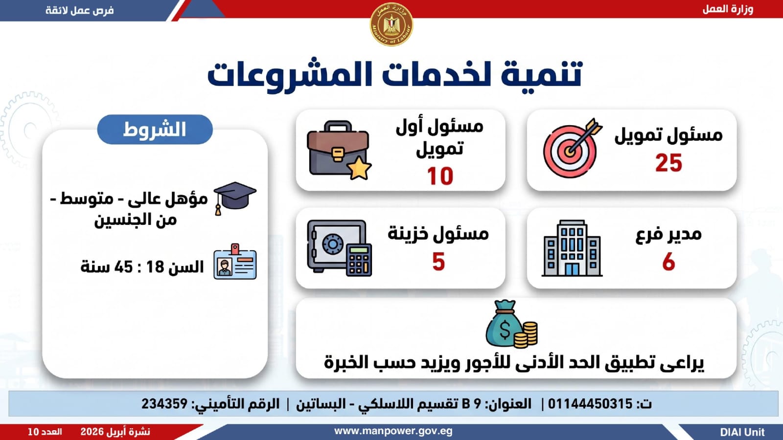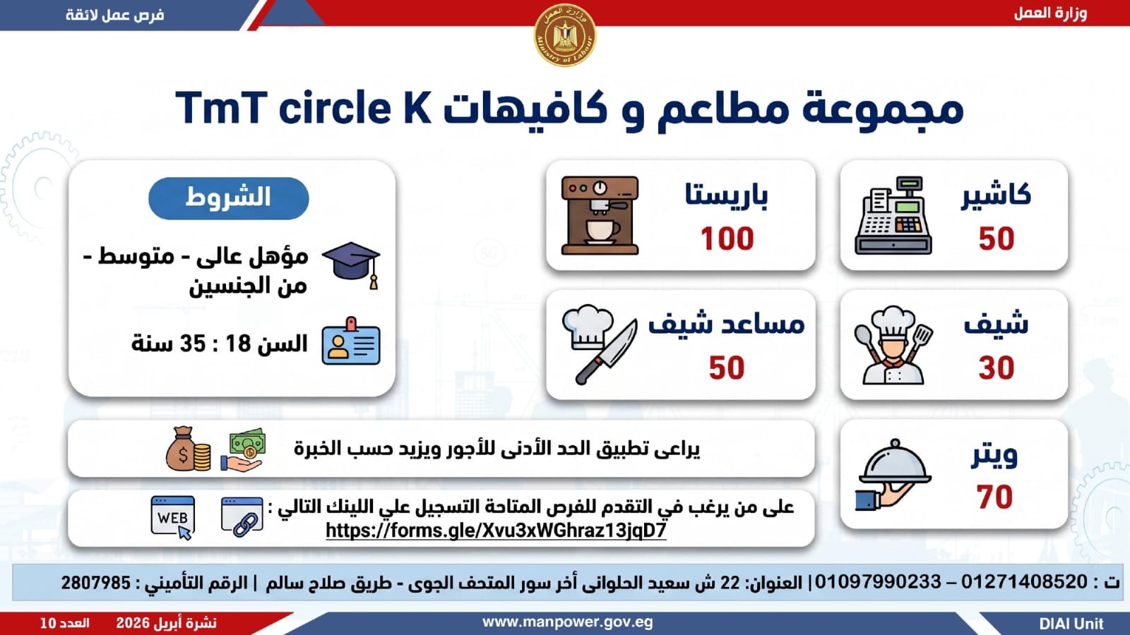 وأوضحت وزارة العمل في بيان لها اليوم أن نشرة التوظيف تتضمن فرصًا متعددة في عشرات المهن والتخصصات، برواتب مجزية يتم تحديدها وفق طبيعة كل وظيفة ونتائج المقابلات الشخصية، مع الالتزام الكامل بتطبيق الحد الأدنى للأجور، فضلًا عن توفير مظلة التأمينات الاجتماعية والصحية، بما يضمن بيئة عمل مستقرة وآمنة تحافظ على حقوق العامل وكرامته...كما تشمل النشرة عددًا من الفرص المخصصة لذوي الهمم، في إطار توجه الدولة نحو تعزيز دمجهم في سوق العمل وإتاحة الفرص المناسبة لقدراتهم...وتغطي فرص العمل الجديدة محافظات: القاهرة، الجيزة، الإسكندرية، الفيوم، الغربية، المنيا، بني سويف، السويس، الأقصر، المنوفية، أسيوط، قنا، والبحر الأحمر، في تخصصات متنوعة تشمل: التسويق، الموارد البشرية، الهندسة (اتصالات وكهرباء)، الميكانيكا والتحكم الكهربائي، الصيانة، المحاسبة، الإشراف الفني والموقعي، الإنتاج، المشتريات، المبيعات، الجودة، الأمن، المخازن، القيادة برخص مختلفة، الفندقة والمطاعم، إلى جانب أعمال الإنتاج والنظافة وعدد من التخصصات الأخرى.