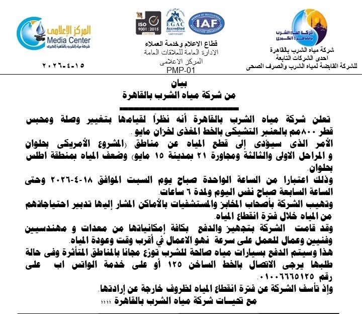 وناشدت الشركة أصحاب المخابز والمستشفيات، وكافة المنشآت الحيوية، بتدبير احتياجاتهم من المياه خلال فترة الانقطاع.