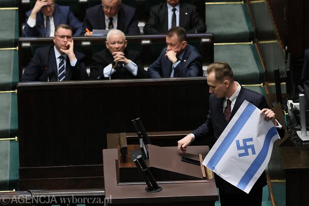 أثار النائب البولندي كونراد بيركوفيتش حالة من الجدل داخل البرلمان، بعدما قام بعرض صورة لعلم إسرائيلي معدل يتضمن رمز الصليب المعقوف، في خطوة أثارت انتقادات واسعة.