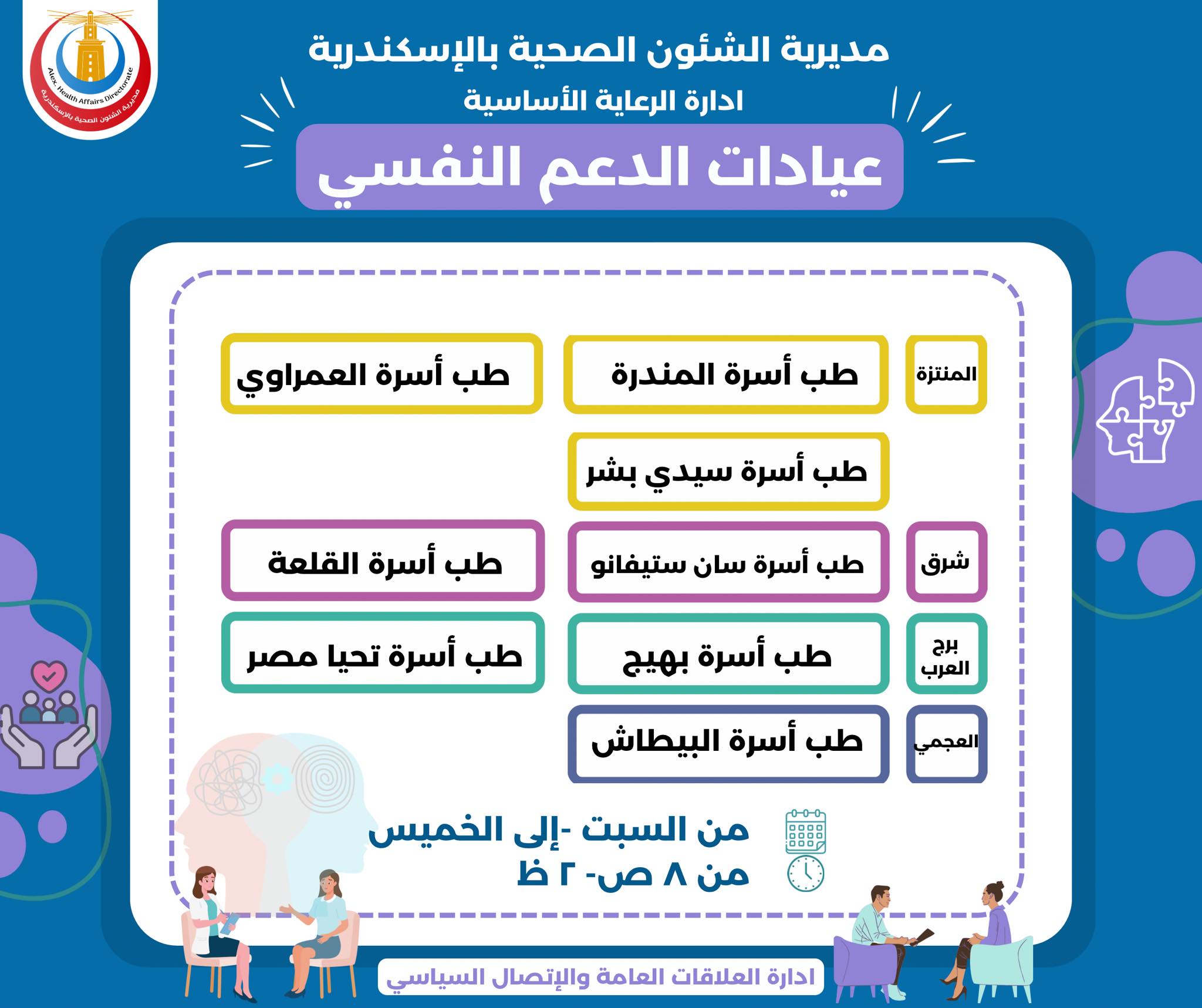 أعلنت مديرية الشئون الصحية بالإسكندرية تقديم خدمات الدعم النفسي بعدد من الوحدات الصحية بالمحافظة، بما يضمن تغطية جغرافية واسعة تسهّل الوصول إلى الخدمة.
