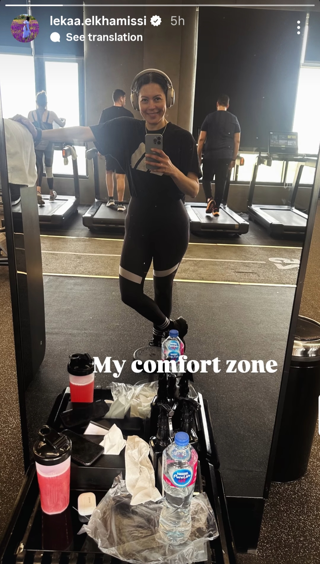 وظهرت لقاء الخميسي وهي تستعرض لياقتها البدنية من الجيم بملابس رياضية كشفت عن رشاقتها،و علقت علي الصورة :مكاني المريح .