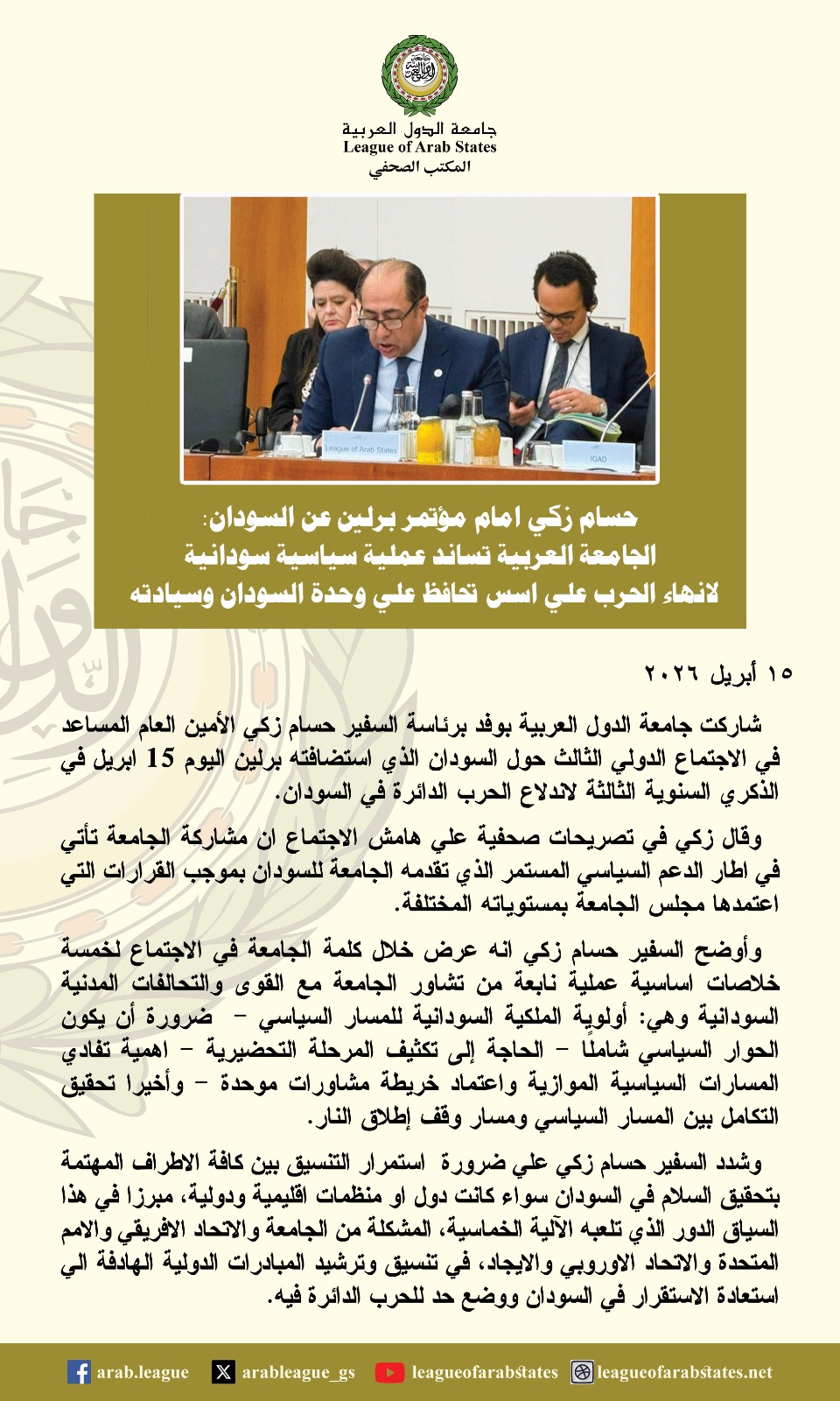 شاركت جامعة الدول العربية بوفد برئاسة السفير حسام زكي الأمين العام المساعد في الاجتماع الدولي الثالث حول السودان الذي استضافته برلين اليوم 15 أبريل في الذكرى السنوية الثالثة لاندلاع الحرب الدائرة في السودان.