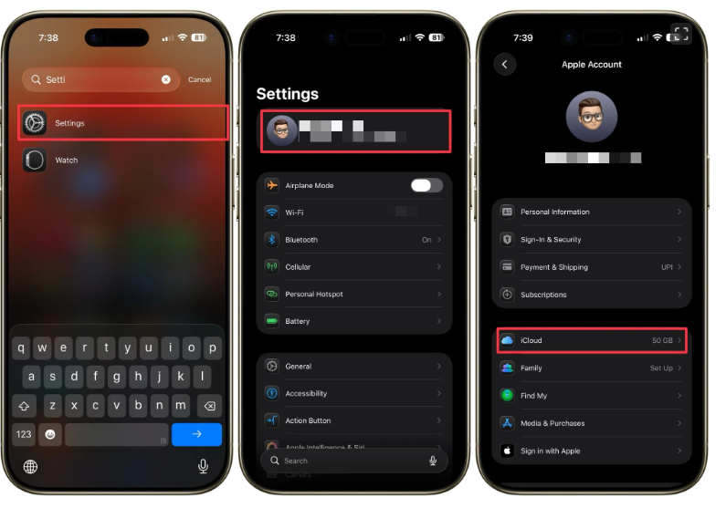 الخطوة الأولى: افتح تطبيق الإعدادات على آيفون، ثم اضغط على اسمك، وادخل إلى إعدادات iCloud.