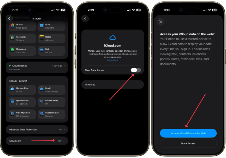 الخطوة الثانية: مرر إلى الأسفل واضغط على iCloud.com، ثم فعل خيار “السماح بالوصول إلى البيانات”.