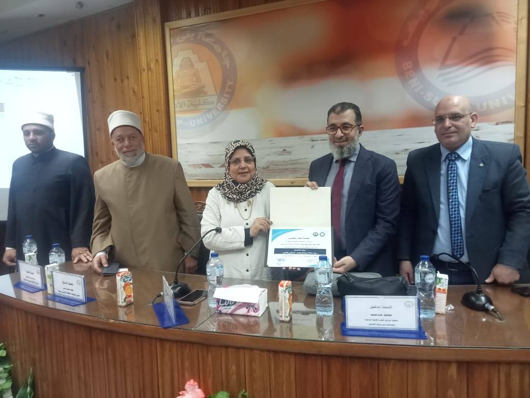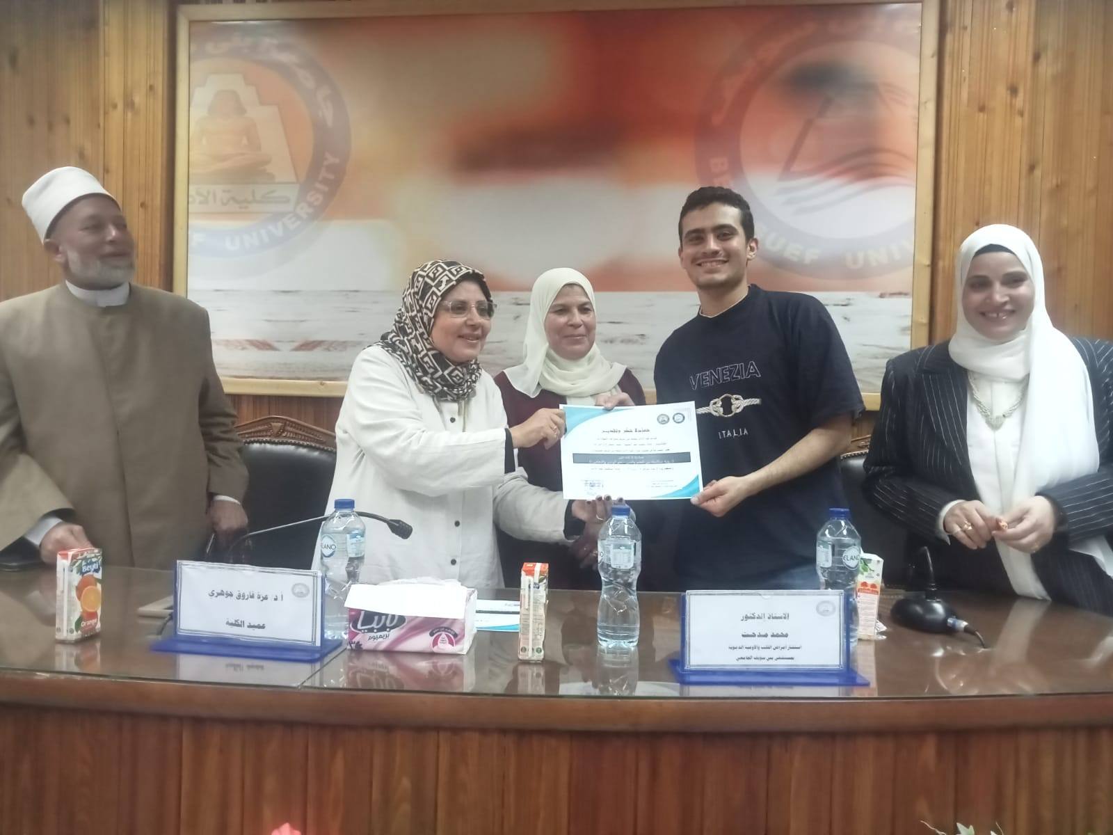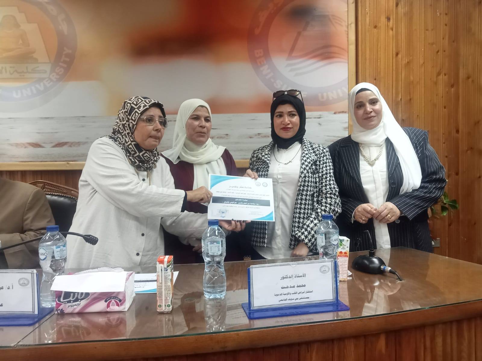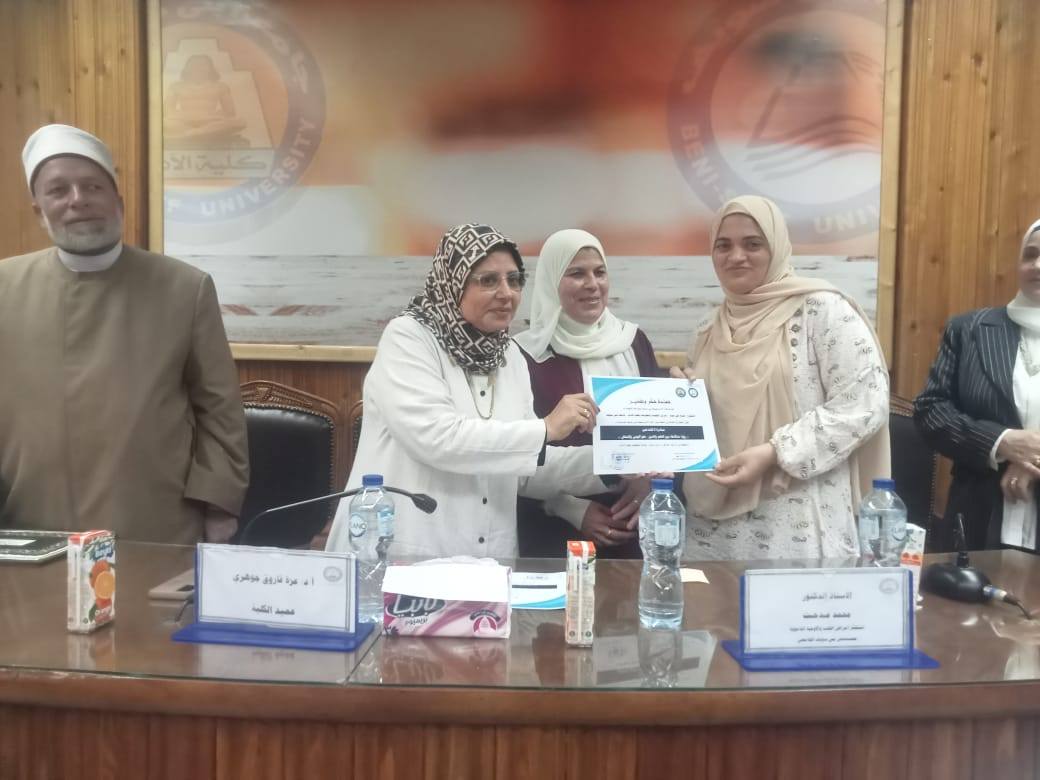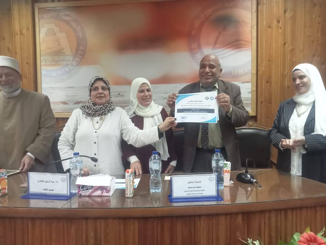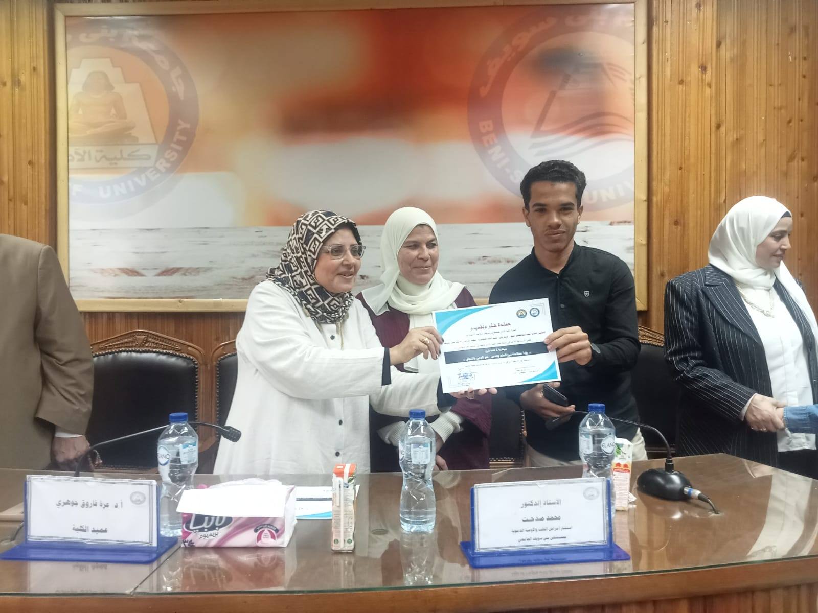 وجاء ذلك بحضور الدكتور حوتة حسين، وكيل الكلية لشؤون الدراسات العليا والبحوث، والدكتوة رحاب يوسف، وكيل الكلية لشؤون التعليم والطلاب، والدكتور جودة مبروك، رئيس قسم اللغة العربية،والعميد الأسبق لكلية الآداب ولفيف من السادة رؤساء الأقسام وأعضاء هيئة التدريس والهيئة المعاونة وإدارة الكلية والعاملين بالكلية، كما حضرت انتصار عبد الباقي، مدير إدارة المشروعات البيئية وخدمة المجتمع بالجامعة.