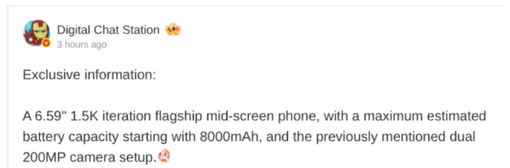 كشف تسريب جديد من حساب Digital Chat Station على موقع Weibo أن الطراز الأساسي سيأتي بشاشة مقاس 6.59 بوصة، يُقال إنها شاشة OLED مسطحة بدقة 1.5K.