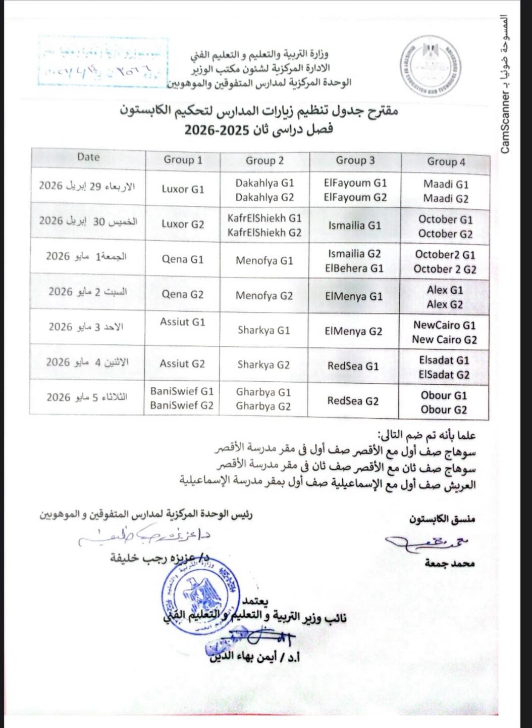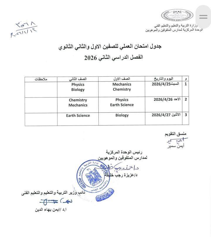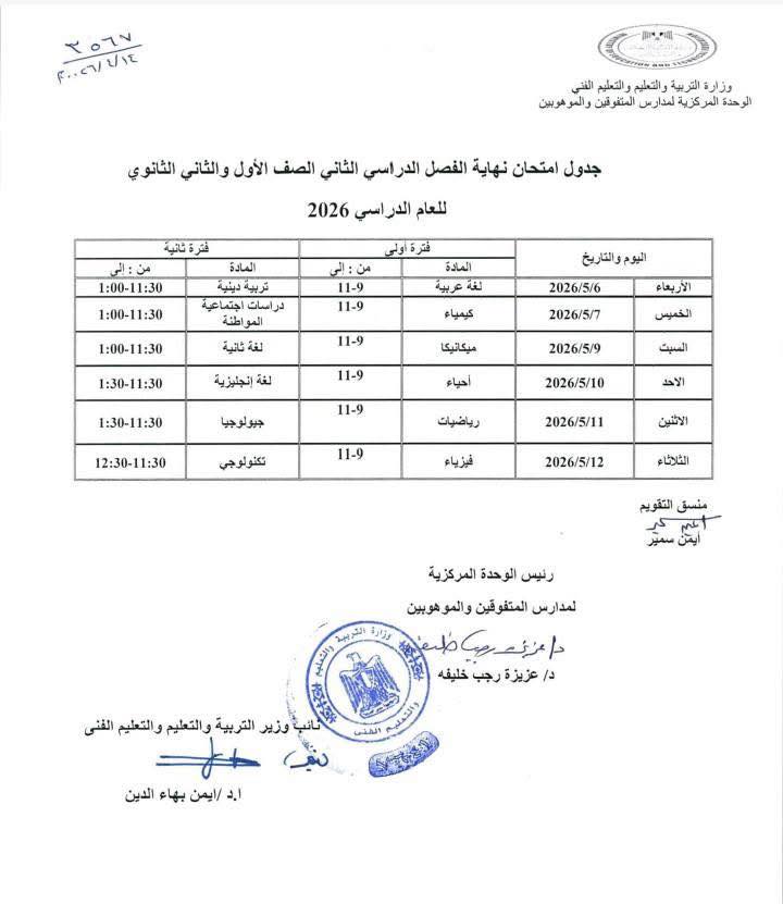 وعلى جانب آخر كانت قد أعلنت وزارة التربية والتعليم والتعليم الفني جدول امتحانات الثانوية العامة 2026 لطلاب الصف الثالث الثانوي بمدارس المتفوقين في العلوم والتكنولوجيا ، كما يلي :