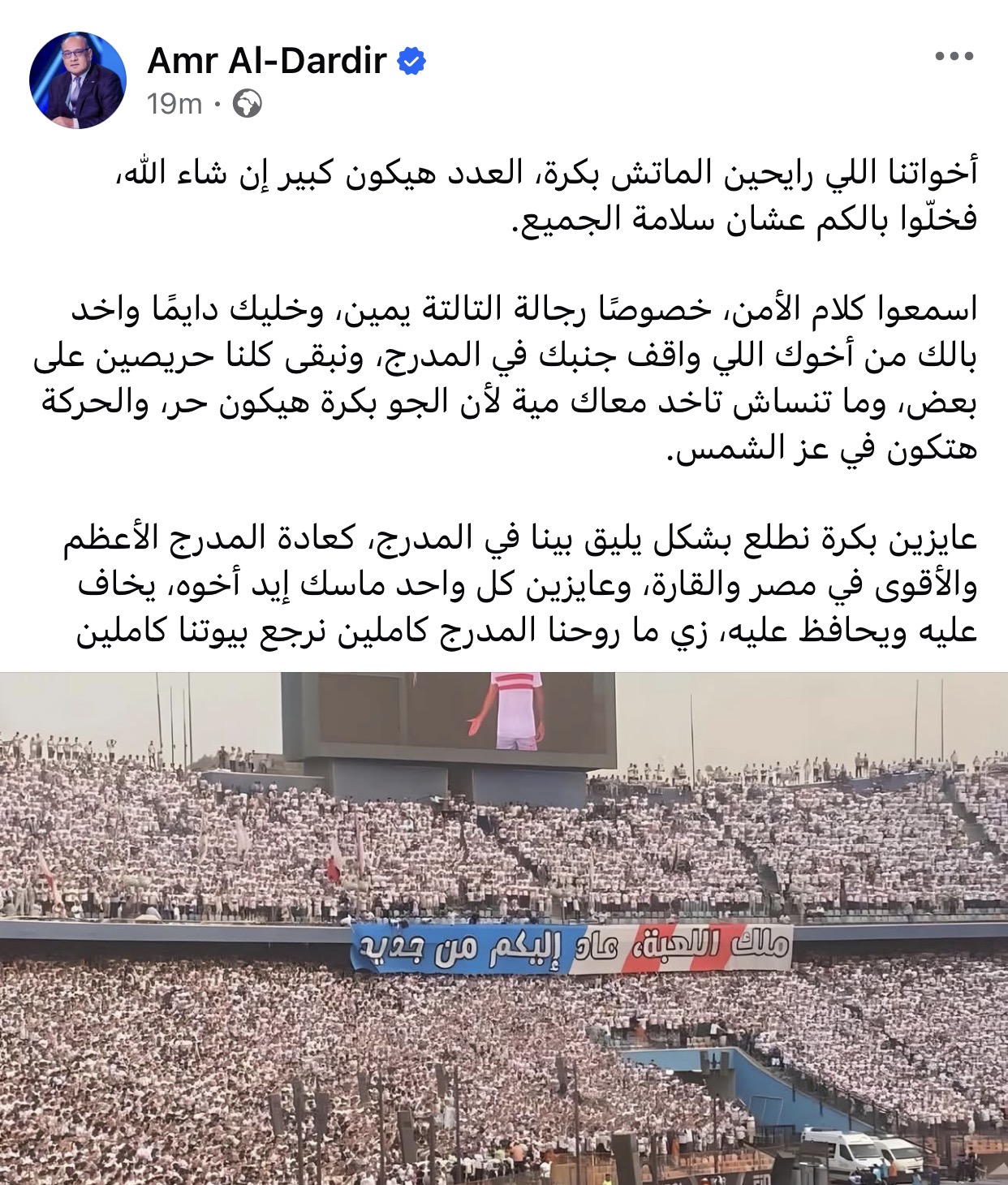 وكتب الدرديري عبر حسابه على “فيسبوك” : “اخواتنا اللي رايحين الماتش بكرة، العدد هيكون كبير إن شاء الله، فخلّوا بالكم عشان سلامة الجميع”.