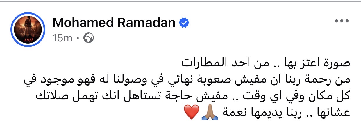 شارك الفنان محمد رمضان جمهوره بصورة جديدة له عبر حسابه الشخصي بموقع فيسبوك، ظهر خلالها أثناء أداء الصلاة داخل أحد المطارات.