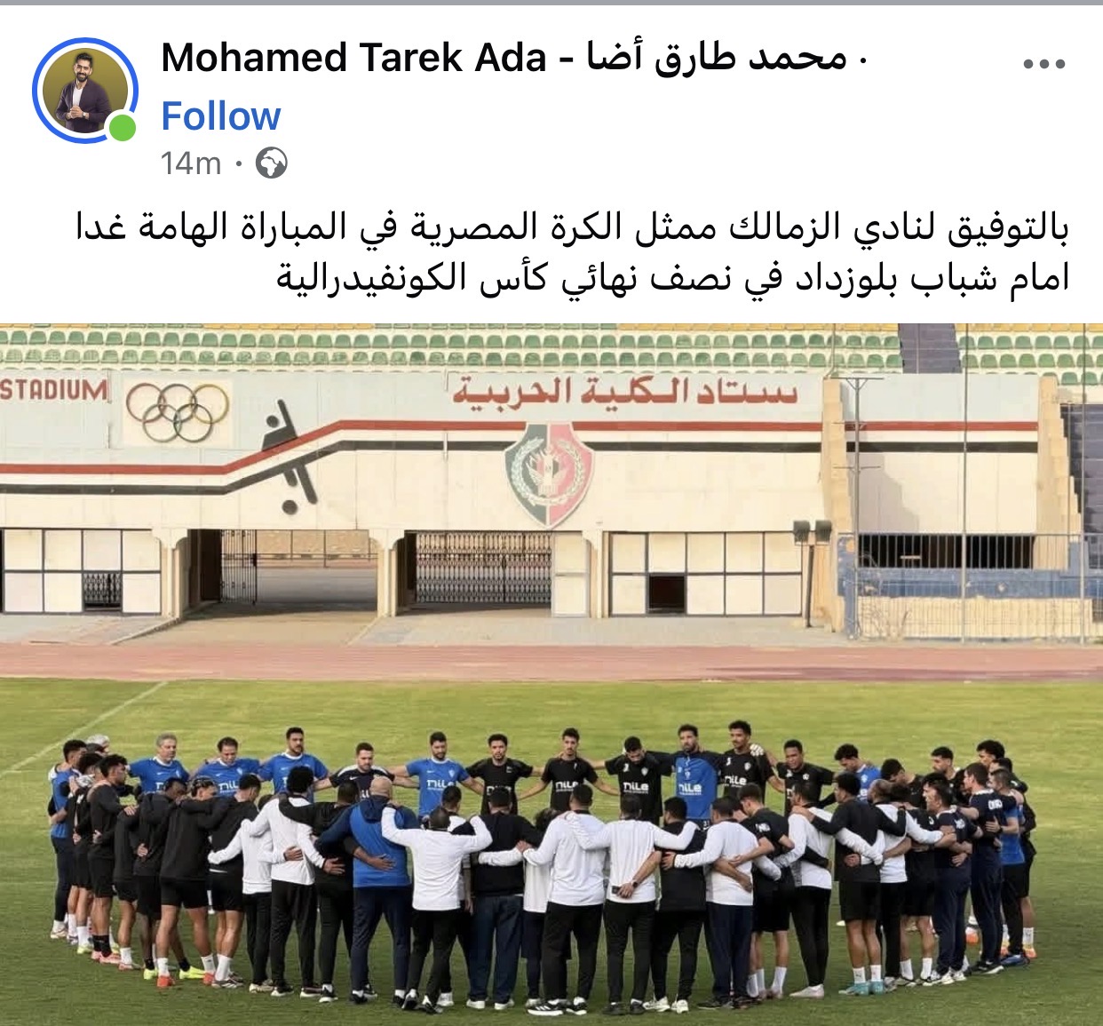 وكتب أضا عبر حسابه الشخصي بموقع فيسبوك: “بالتوفيق لنادي الزمالك ممثل الكرة المصرية في المباراة الهامة غدا امام شباب بلوزداد في نصف نهائي كأس الكونفيدرالية".