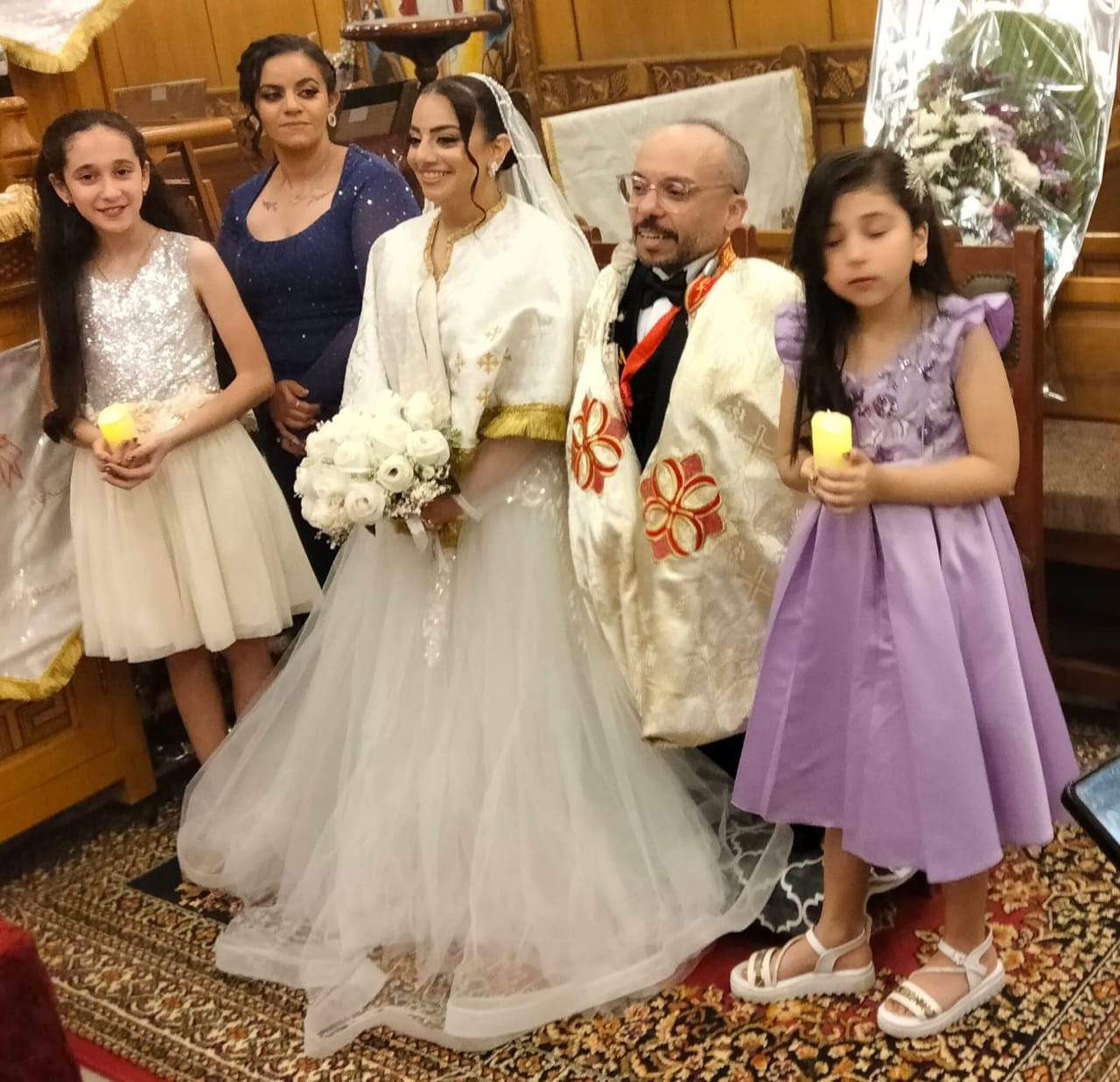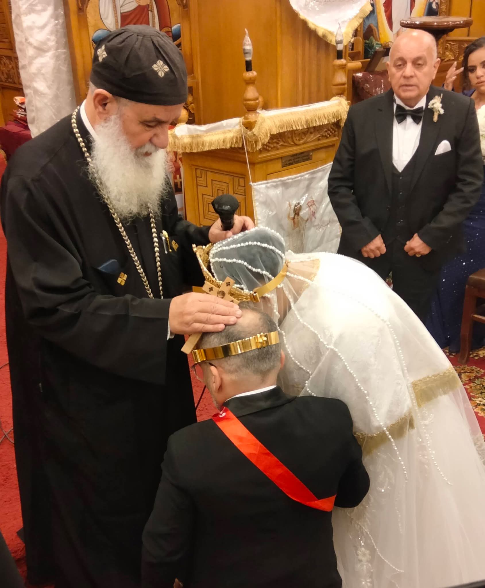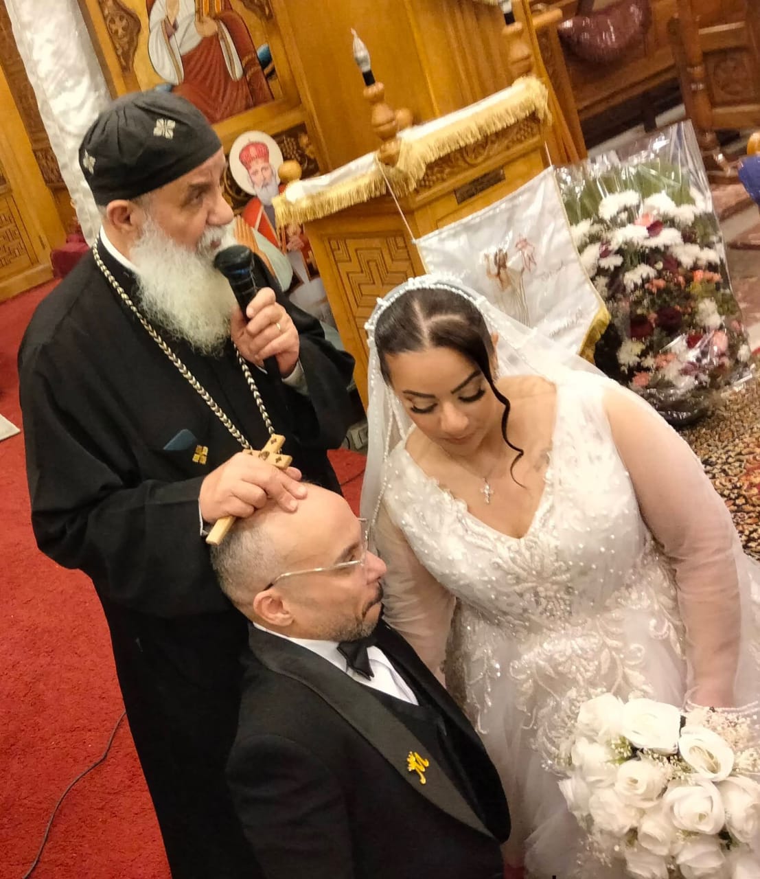 احتفل العروسين بالزفاف وإتمام الزواج بالطقوس الدينية الكنسية بحضور كهنة واساقفة كنيسة بنها حيث ظهرت في صور الزفاف خضوع العروسين الطقوس وادائها لاتمام الزواج دون حضور فني او مشاركة من أصدقاء مينا من الممثلين حيثفضل العروسين إتمام الزفاف في أجواء عائلية واسرية في مسقط رأس العريس ببنها.
