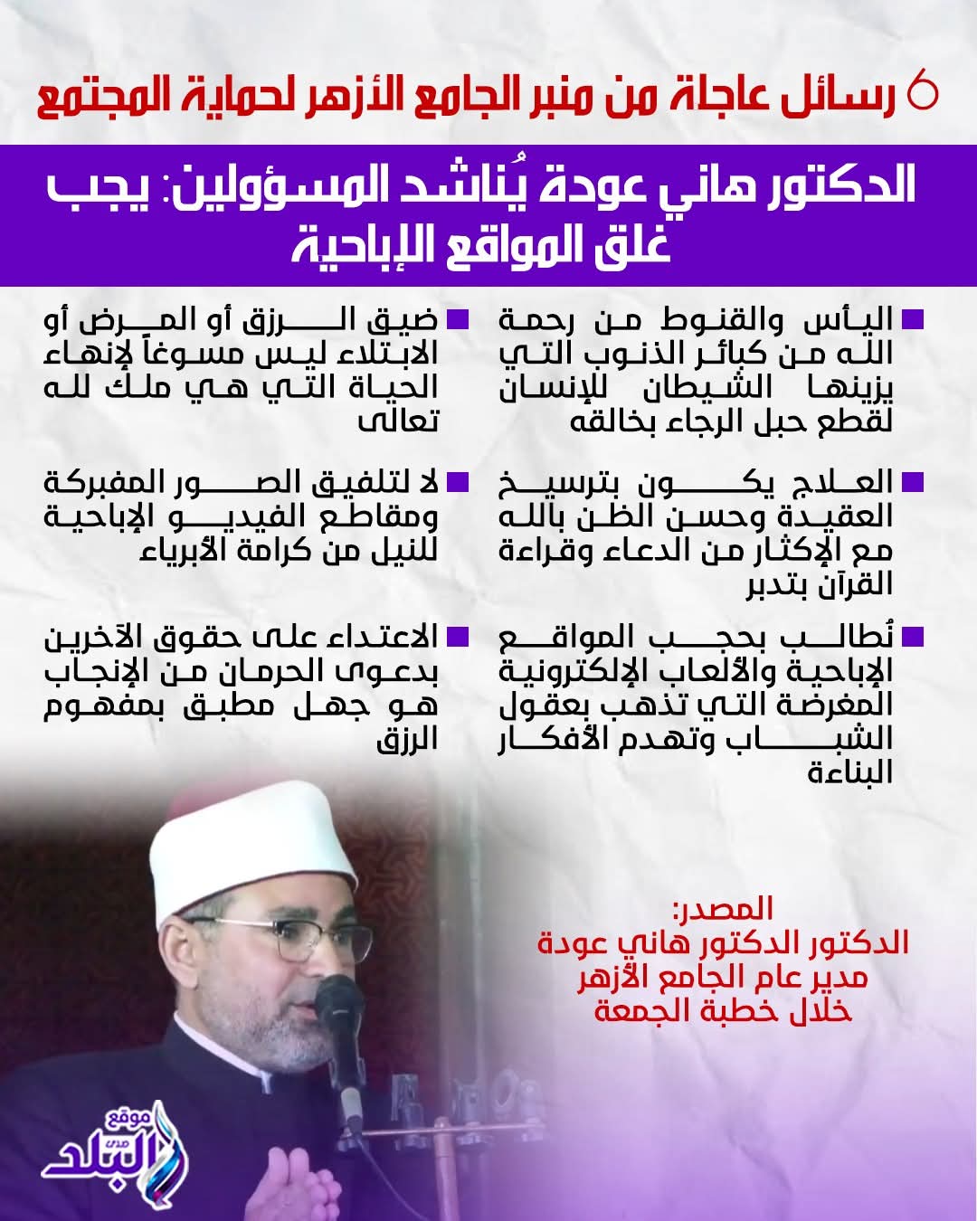 وفي نداء للشباب، رفع خطيب الجامع الأزهر شعار «لا للانتحار فهو من الكبائر، وندعو لعدم اليأس من رحمة الله»، موضحاً أن ضيق الرزق أو المرض أو الابتلاء ليس مسوغاً لإنهاء الحياة التي هي ملك للخالق سبحانه، وأشار إلى أن نسب الانتحار التي بلغت 80% بين الرجال عالمياً تستوجب وقفة جادة، مذكراً بقوله تعالى: ﴿وَلَا تَقْتُلُوا أَنفُسَكُمْ ۚ إِنَّ اللَّهَ كَانَ بِكُمْ رحيماً﴾، ومؤكداً أن العلاج يكمن في اللجوء إلى الله ومصاحبة الأخيار.