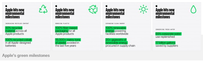 وفي بعض المكونات الداخلة في تصنيع أجهزتها تصل نسبة المكون المعاد تدويره إلى 100%، مثل البطاريات المصنوعة من الكوبالت المعاد تدويره بالكامل، كذلك المغناطيسات مصنوعة من عناصر أرضية نادرة معاد تدويرها كاملة.
