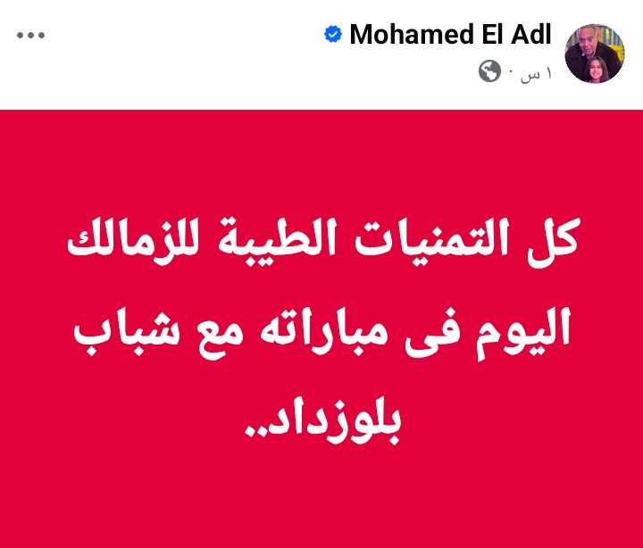 وكتب العدل عبر حسابه الشخصي بموقع فيسبوك: “كل التمنيات الطيبة للزمالك اليوم فى مباراته مع شباب بلوزداد”.