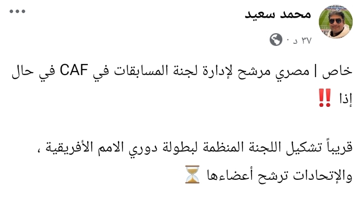 وكتب الإعلامي محمد سعيد، عبر صفحته على فيسبوك،: “خاص| هناك ترشيحات لشخصية مصرية لتولي إدارة لجنة المسابقات داخل الكاف، في حال إعادة تشكيل اللجنة المنظمة المرتبطة ببطولة دوري الأمم الأفريقية، مع فتح الباب أمام الاتحادات الأعضاء لترشيح ممثليها داخل اللجان المختلفة".