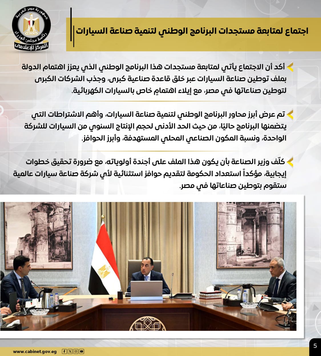 كما عقد اجتماعًا، لمتابعة مستجدات البرنامج الوطني لتنمية صناعة السيارات، مؤكدًا أن الاجتماع يأتي لمتابعة مستجدات هذا البرنامج الوطني الذي يعزز اهتمام الدولة بملف توطين صناعة السيارات عبر خلق قاعدة صناعية كبرى، وجذب الشركات الكبرى لتوطين صناعاتها في مصر، مع إيلاء اهتمامٍ خاص بالسيارات الكهربائية.