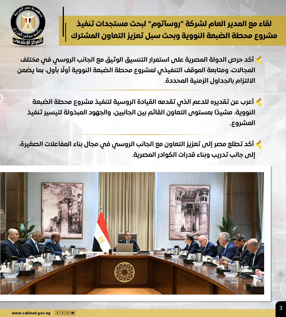 كما التقى المدير العام لشركة "روسآتوم" لبحث مستجدات تنفيذ مشروع محطة الضبعة النووية وبحث سبل تعزيز التعاون المشترك، مؤكدًا حرص الدولة على استمرار التنسيق الوثيق مع الجانب الروسي في مختلف المجالات، ومتابعة الموقف التنفيذي لمشروع محطة الضبعة النووية أولًا بأول، بما يضمن الالتزام بالجداول الزمنية المحددة.