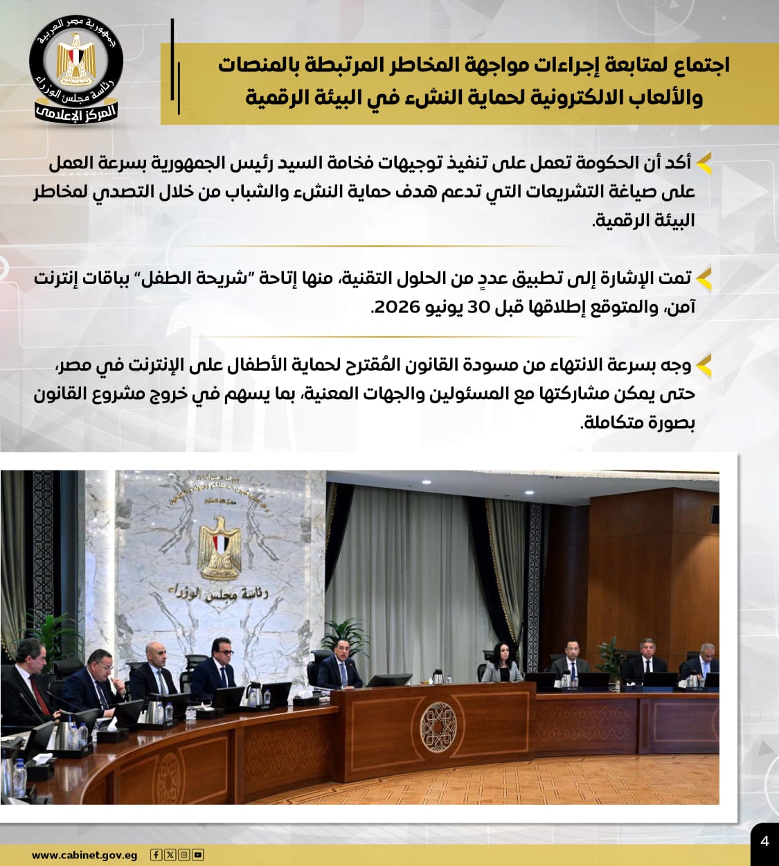 كما وجه رئيس الوزراء بسرعة الانتهاء من مسودة القانون المُقترح لحماية الأطفال على الإنترنت في مصر، حتى يمكن مشاركتها مع المسؤولين والجهات المعنية، بما يسهم في خروج مشروع القانون بصورة متكاملة.