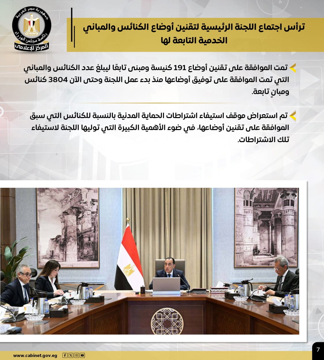 وترأس اجتماع اللجنة الرئيسية لتقنين أوضاع الكنائس والمباني الخدمية التابعة لها، والذي تم خلاله الموافقة على تقنين أوضاع 191 كنيسة ومبنى تابعًا ليبلغ عدد الكنائس والمباني التي تمت الموافقة على توفيق أوضاعها منذ بدء عمل اللجنة وحتى الآن 3804 كنائس ومبانٍ تابعة.