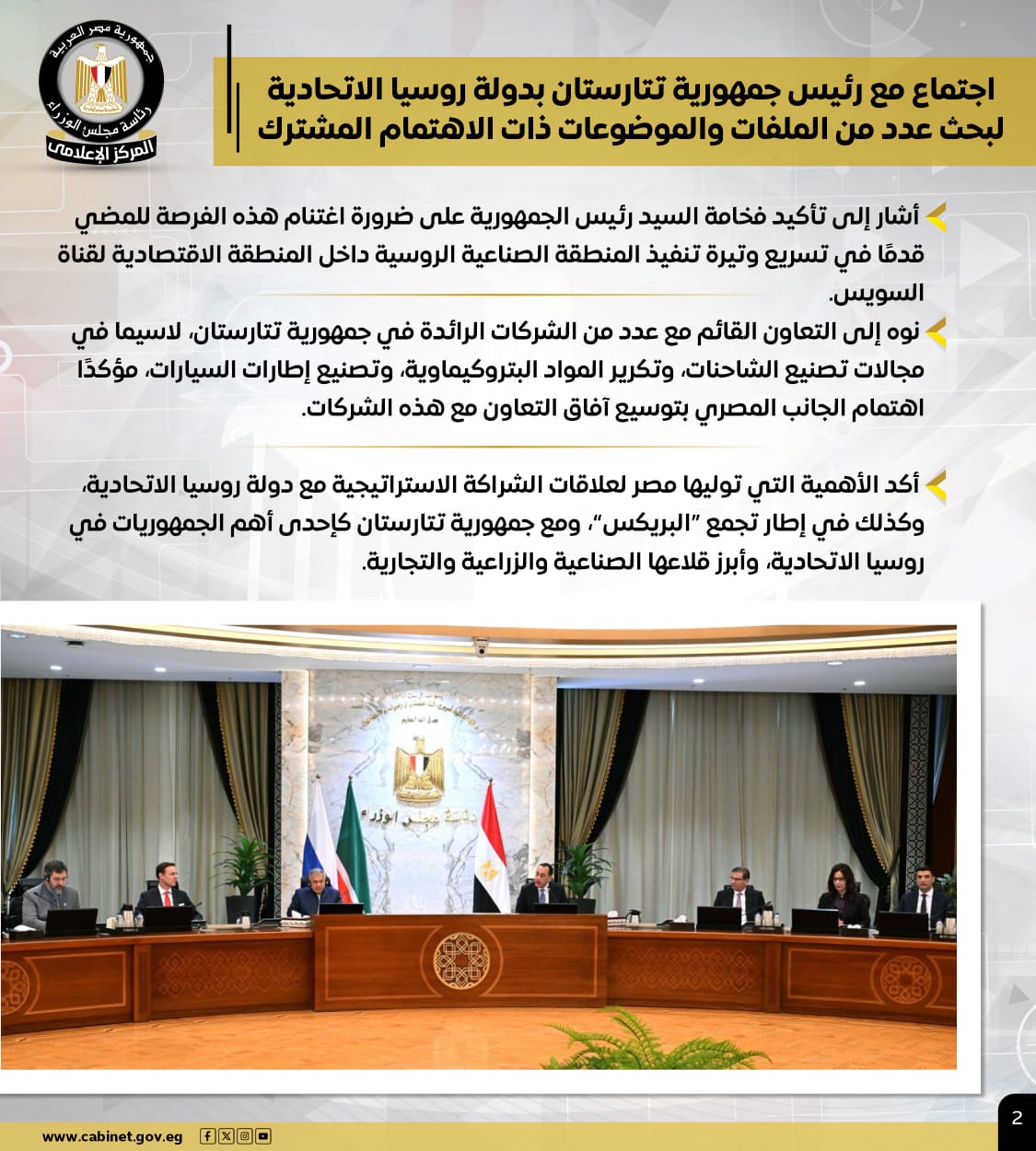 وخلال الاجتماع نوه إلى التعاون القائم مع عدد من الشركات الرائدة في جمهورية تتارستان، لاسيما في مجالات تصنيع الشاحنات، وتكرير المواد البتروكيماوية، وتصنيع إطارات السيارات، مؤكدًا اهتمام الجانب المصري بتوسيع آفاق التعاون مع هذه الشركات، مؤكدًا الأهمية التي توليها مصر لعلاقات الشراكة الاستراتيجية مع دولة روسيا الاتحادية، وكذلك في إطار تجمع "البريكس"، ومع جمهورية تتارستان كإحدى أهم الجمهوريات في روسيا الاتحادية، وأبرز قلاعها الصناعية والزراعية والتجارية.