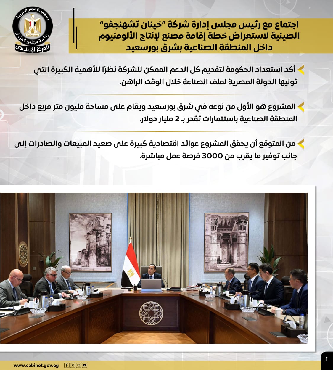 وتضمنت الأنشطة، اجتماع رئيس الوزراء مع رئيس مجلس إدارة شركة "خينان تشهنجفو" الصينية لاستعراض خطة إقامة مصنع لإنتاج الألومنيوم داخل المنطقة الصناعية بشرق بورسعيد، مؤكدًا استعداد الحكومة لتقديم كل الدعم الممكن للشركة نظرًا للأهمية الكبيرة التي توليها الدولة المصرية لملف الصناعة خلال الوقت الراهن.