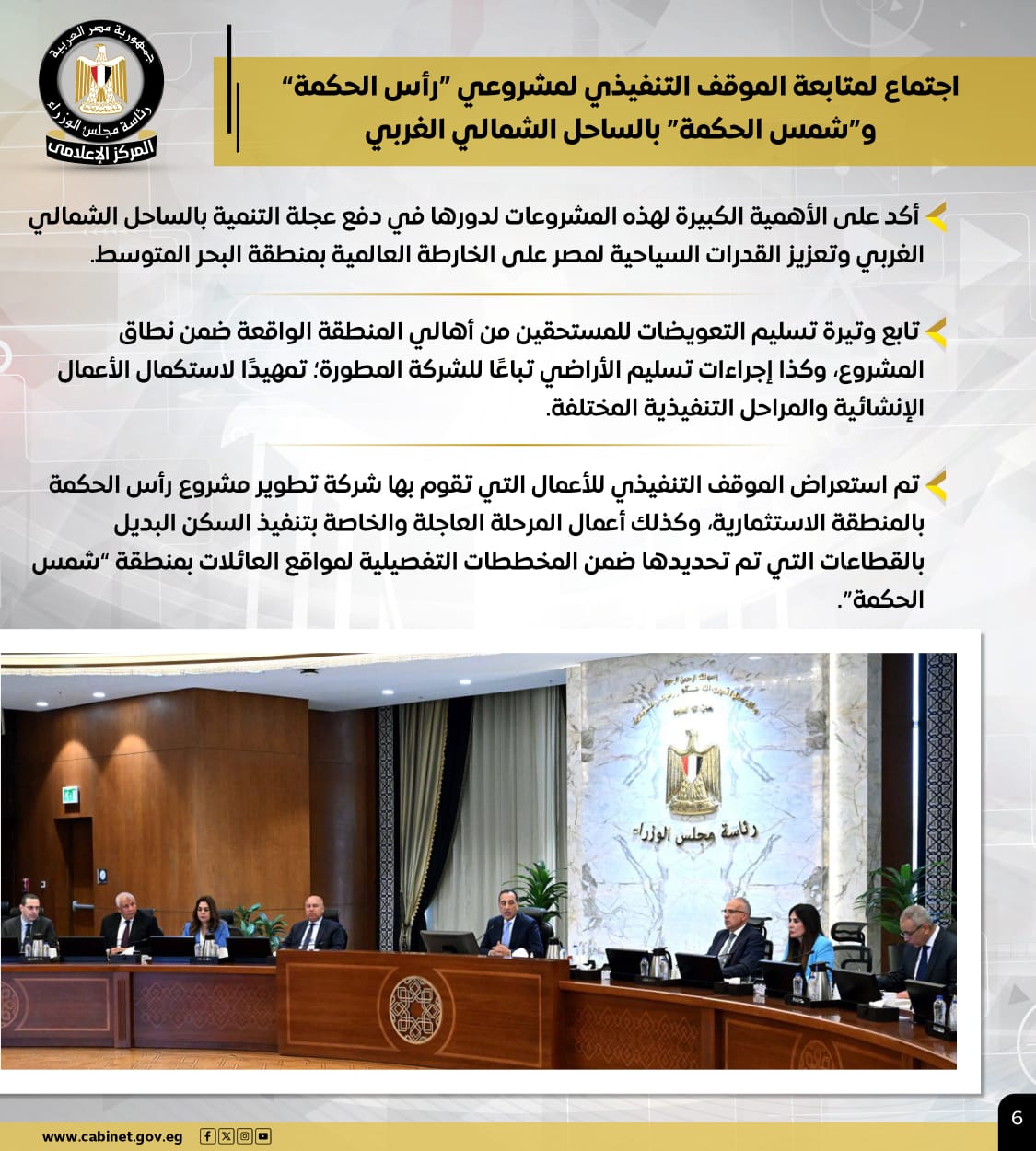 كما تم استعراض الموقف التنفيذي للأعمال التي تقوم بها شركة تطوير مشروع رأس الحكمة بالمنطقة الاستثمارية، وكذلك أعمال المرحلة العاجلة والخاصة بتنفيذ السكن البديل بالقطاعات التي تم تحديدها ضمن المخططات التفصيلية لمواقع العائلات بمنطقة "شمس الحكمة".