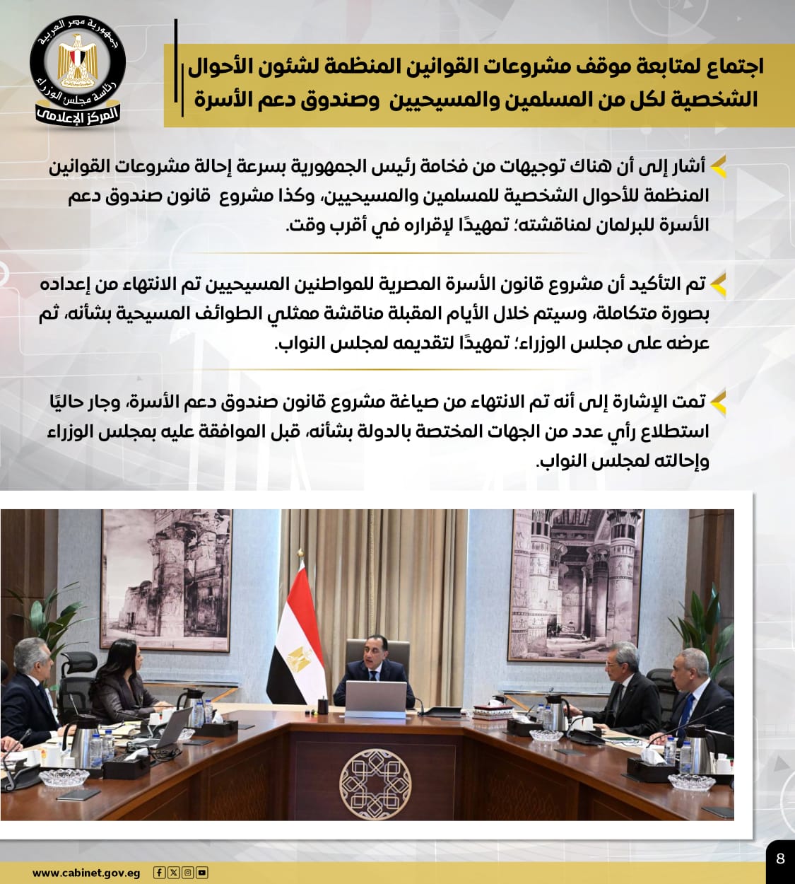 وعقد رئيس الوزراء اجتماعًا لمتابعة موقف مشروعات القوانين المنظمة لشئون الأحوال الشخصية لكل من المسلمين والمسيحيين وصندوق دعم الأسرة، مشيرًا إلى أن هناك توجيهات من رئيس الجمهورية بسرعة إحالة مشروعات القوانين المنظمة للأحوال الشخصية للمسلمين والمسيحيين، وكذا مشروع قانون صندوق دعم الأسرة للبرلمان لمناقشته؛ تمهيدًا لإقراره في أقرب وقت.