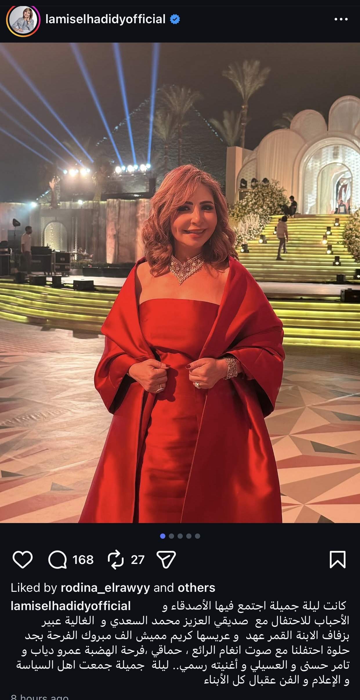 وظهرت لميس الحديدي بإطلالة أنيقة لفتت الأنظار، حيث اختارت فستانًا باللون الأحمر، وعلّقت على الأجواء التي وصفتها بالمميزة، مؤكدة أن الحفل شهد تجمعًا دافئًا للأصدقاء والمقربين احتفالًا بهذه المناسبة السعيدة.