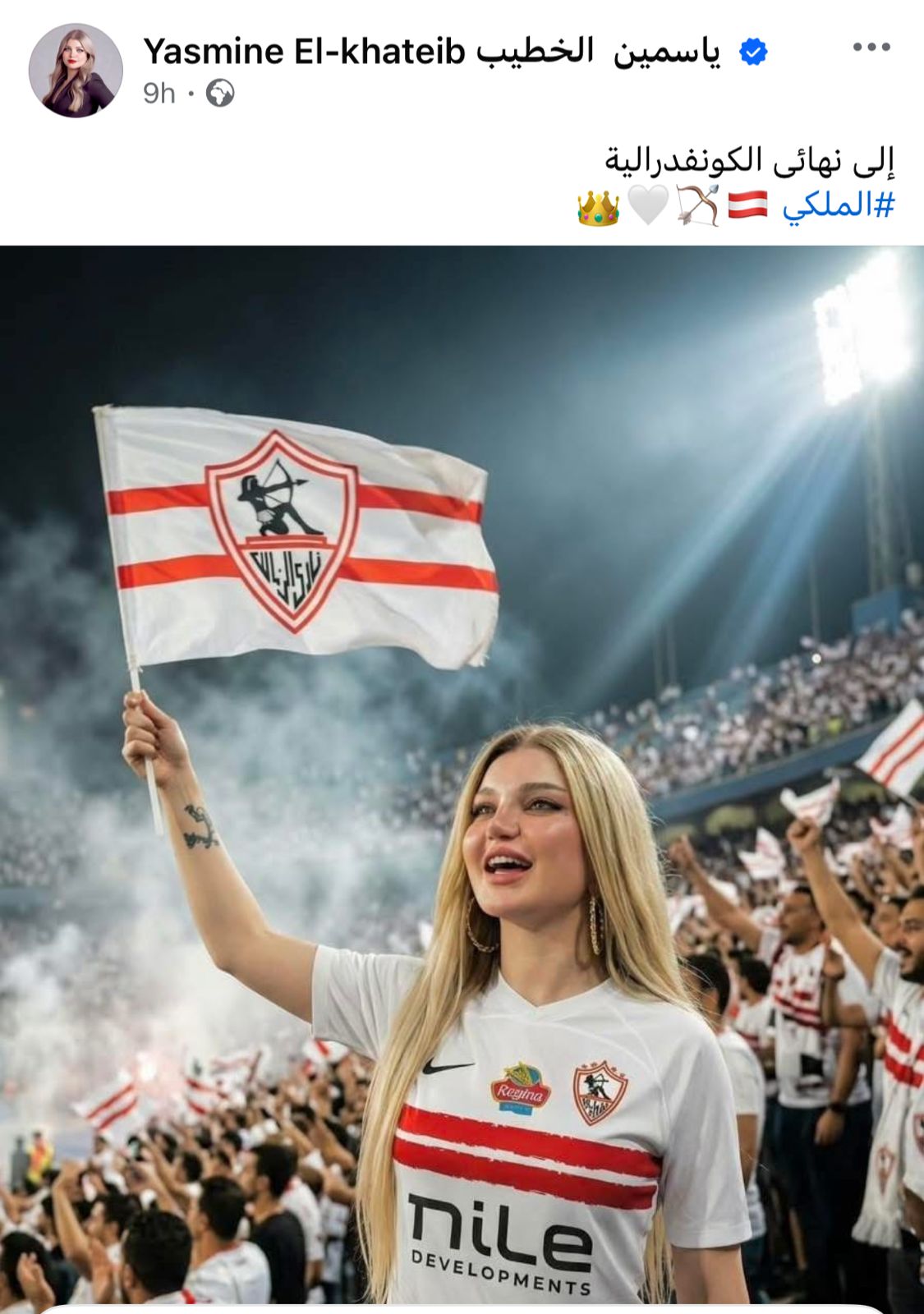 وشاركت ياسمين الخطيب صورة بقميص نادي الزمالك، وعلقت: “إلى نهائي الكونفدرالية الملكي”.