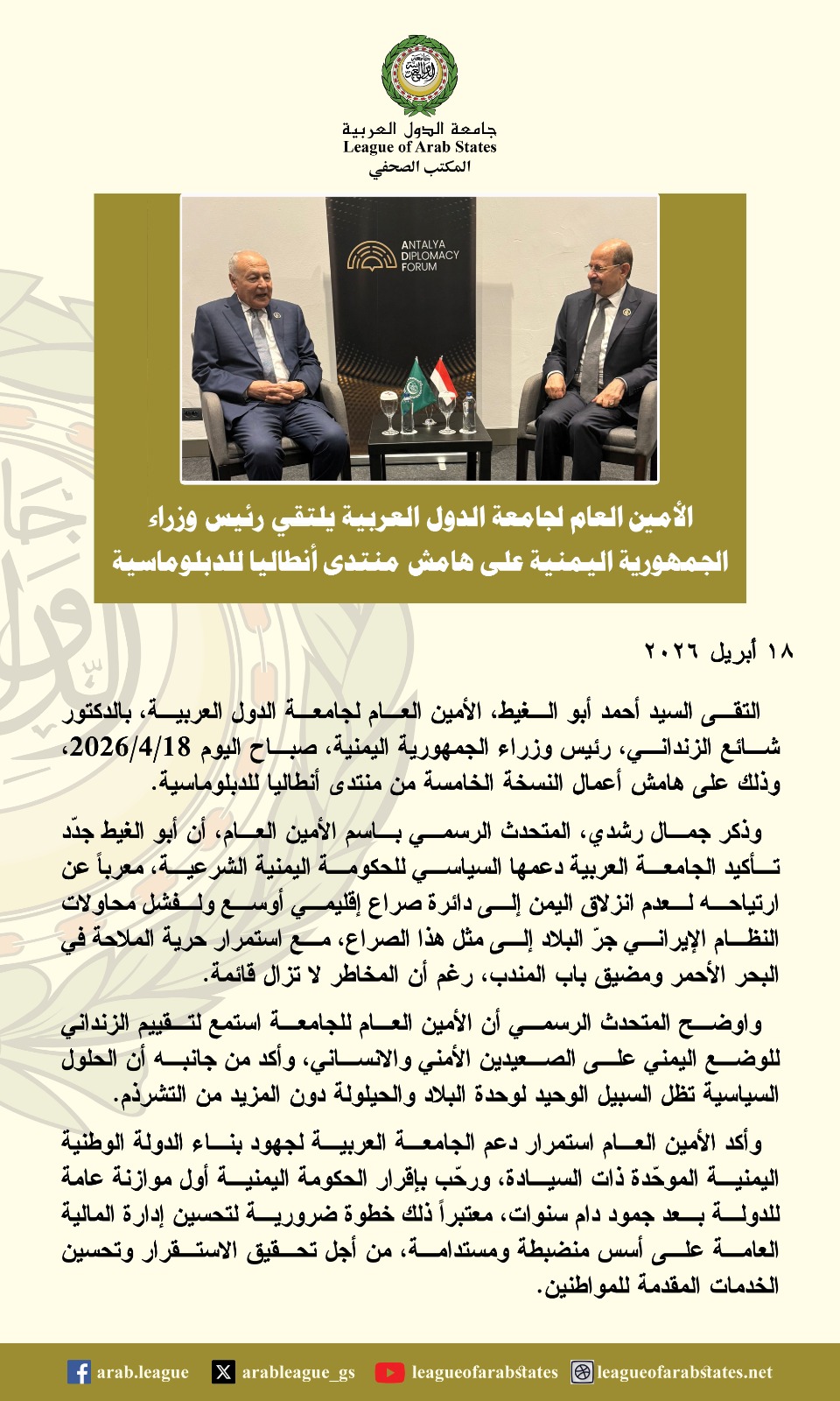 التقى أحمد أبو الغيط، الأمين العام لجامعة الدول العربية، بالدكتور شائع الزنداني، رئيس وزراء الجمهورية اليمنية، صباح اليوم 18 أبريل 2026، وذلك على هامش أعمال النسخة الخامسة من منتدى أنطاليا للدبلوماسية.