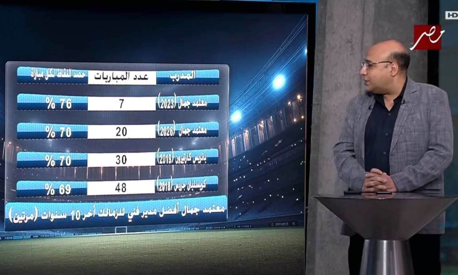 كشف الناقد الرياضي خالد طلعت مفاجأة مدوية بشأن أرقام مدرب القلعة البيضاء معتمد جمال .