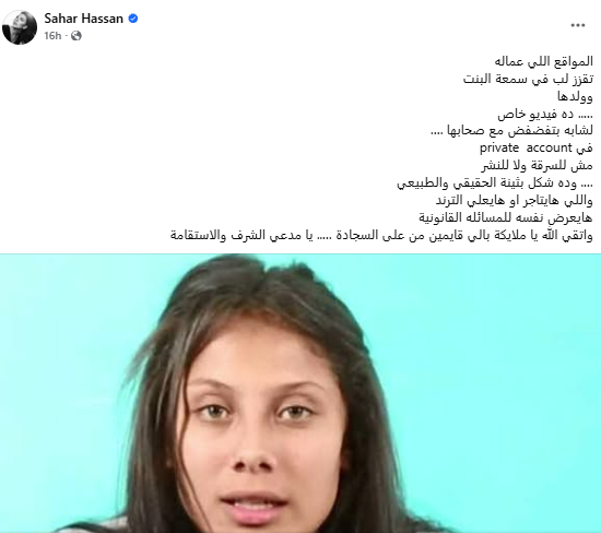 وكتبت بثينة حسن، عبر حسابها الشخصي على موقع التواصل الاجتكاعي فيسبوك: «المواقع اللي عمالة تقزز لب في سمعة البنت ووالدها.. ده فيديو خاص لشابة بتفضفض مع صحابها في private account مش للسرقة ولا للنشر».