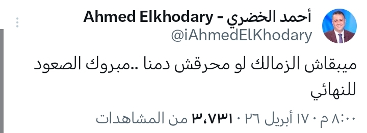 وكتب «الخصري» عبر حسابه على موقع التواصل الاجتماعي «فيسبوك»: «ميبقاش الزمالك لو محرقش دمنا ..مبروك الصعود للنهائي».