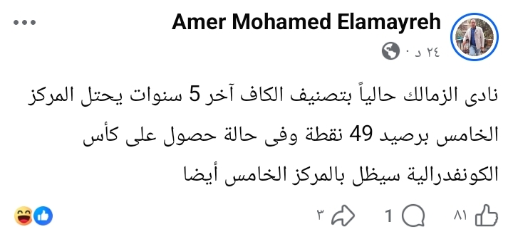 وأوضح العمايرة عبر حسابه علي فيسبوك" أن تتويج الزمالك بلقب كأس الكونفدرالية الأفريقية لن يغير من ترتيبه في التصنيف، حيث سيبقى في المركز الخامس رغم إضافة اللقب إلى سجله القاري.